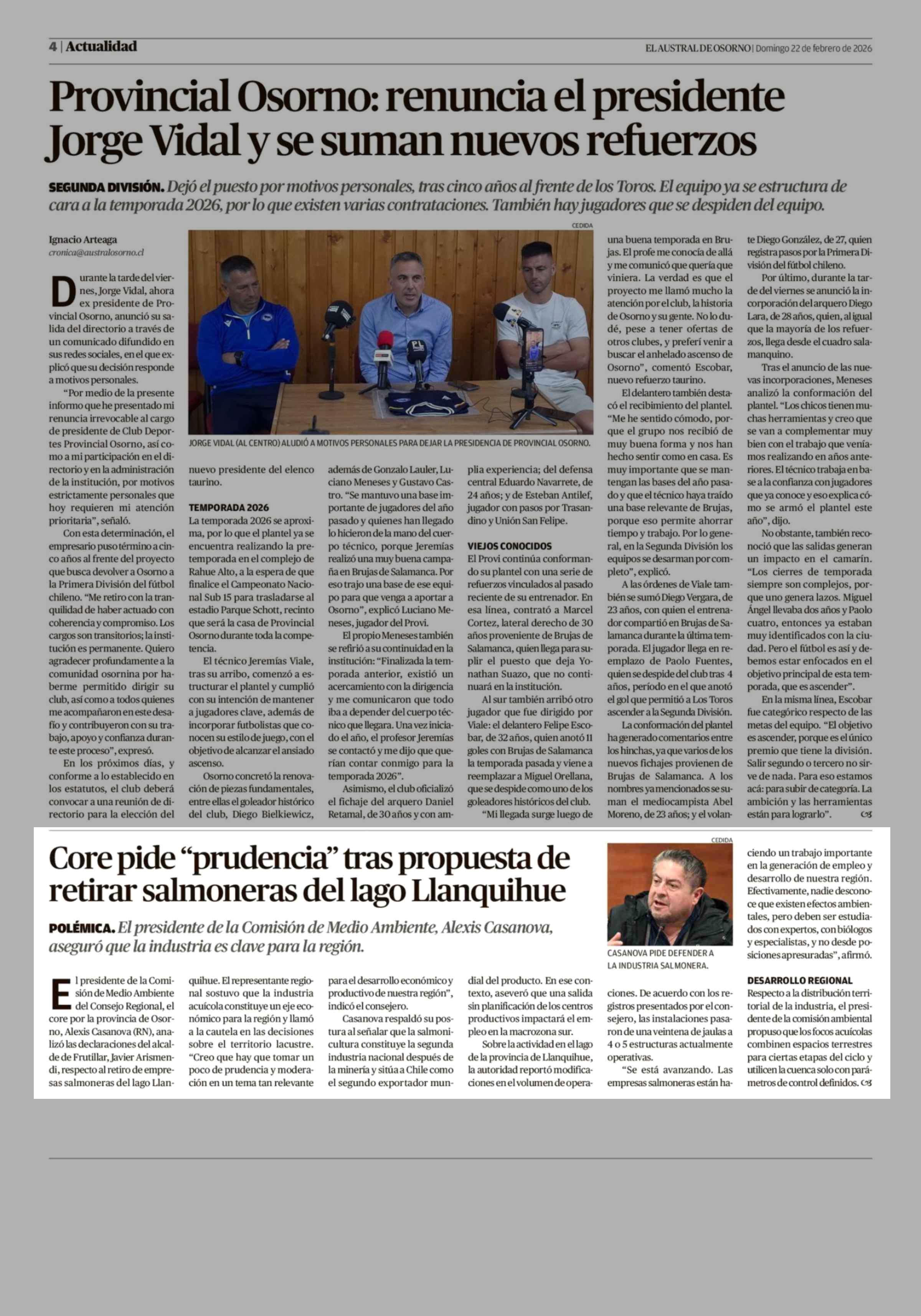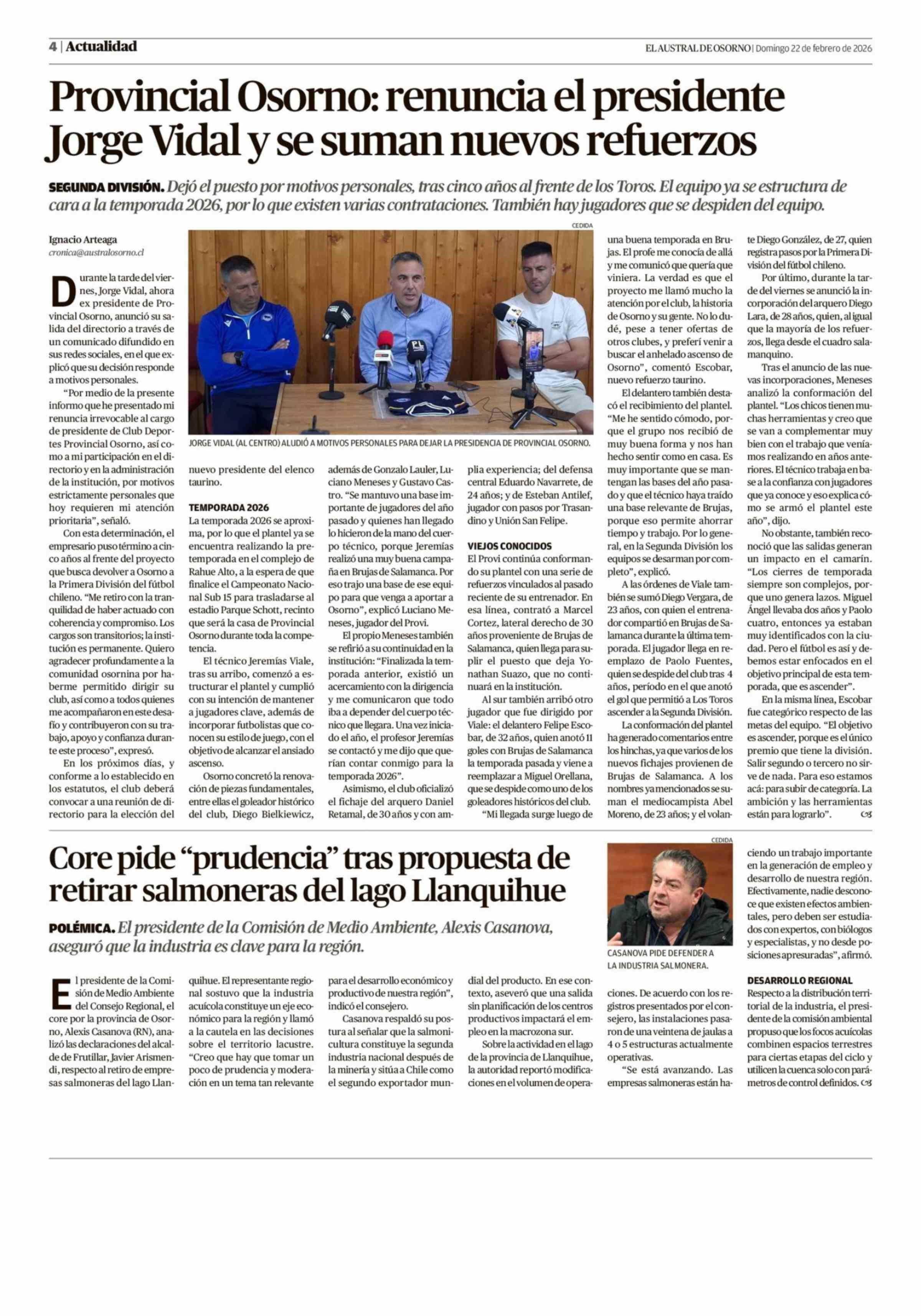 Core pide "prudencia" tras propuesta de retirar salmoneras del lago Llanquihue 22-02-2026 El Austral de Osorno |