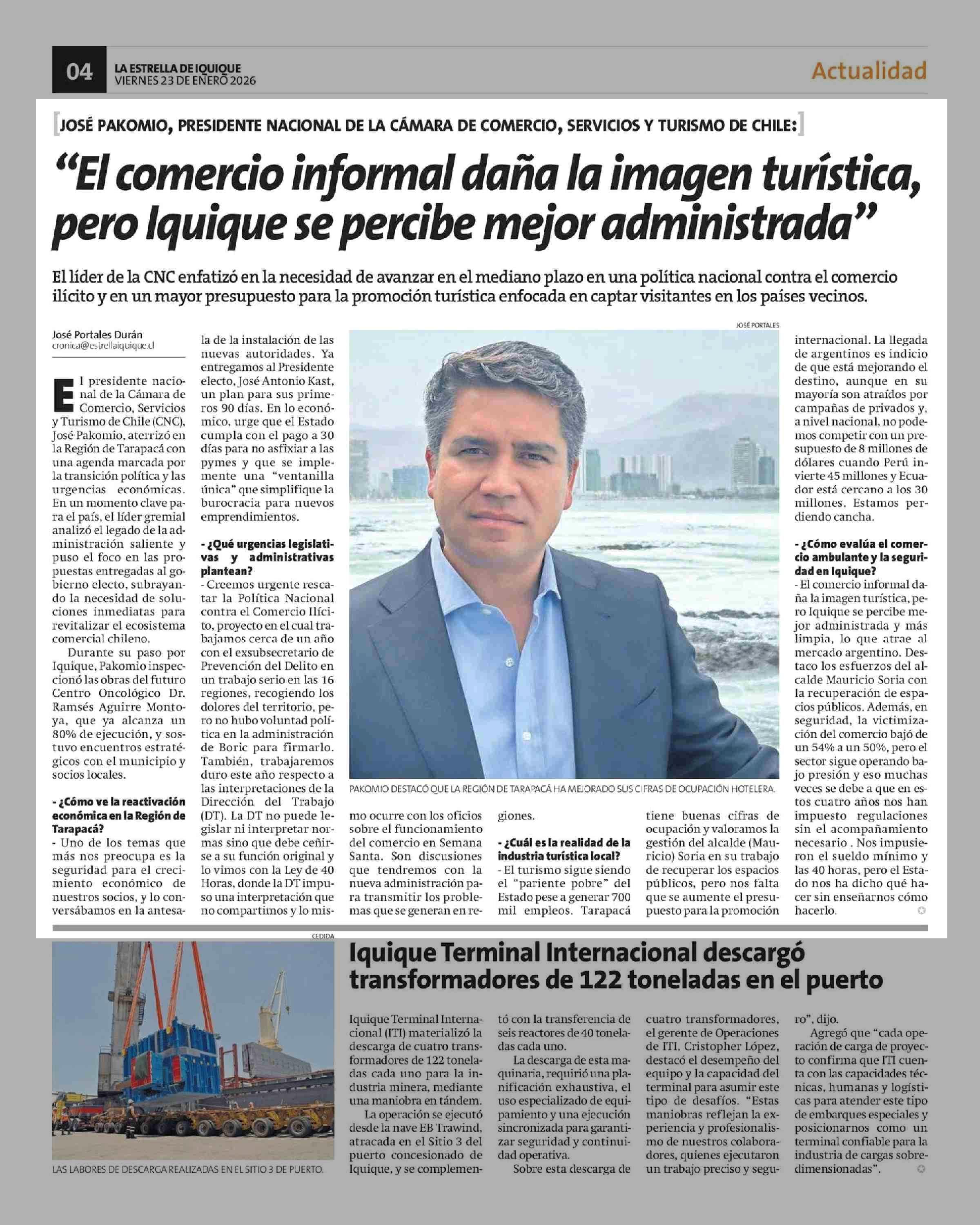 "El comercio informal daña la imagen turística, pero Iquique se percibe mejor administrada" 23-01-2026 La Estrella de Iquique |
