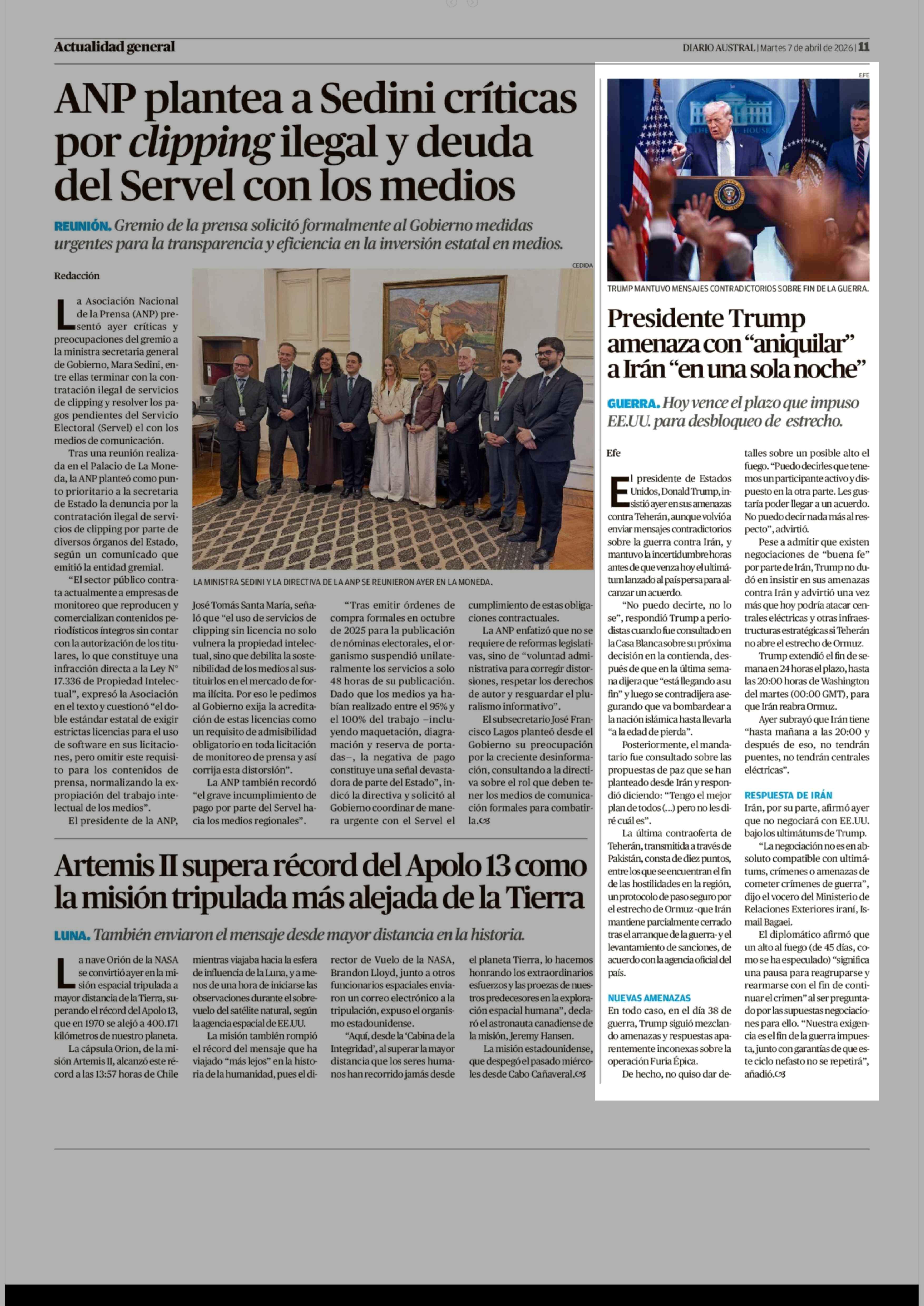 Presidente Trump amenaza con "aniquilar" a Irán "en una sola noche" 07-04-2026 Diario Austral Región de Los Ríos |