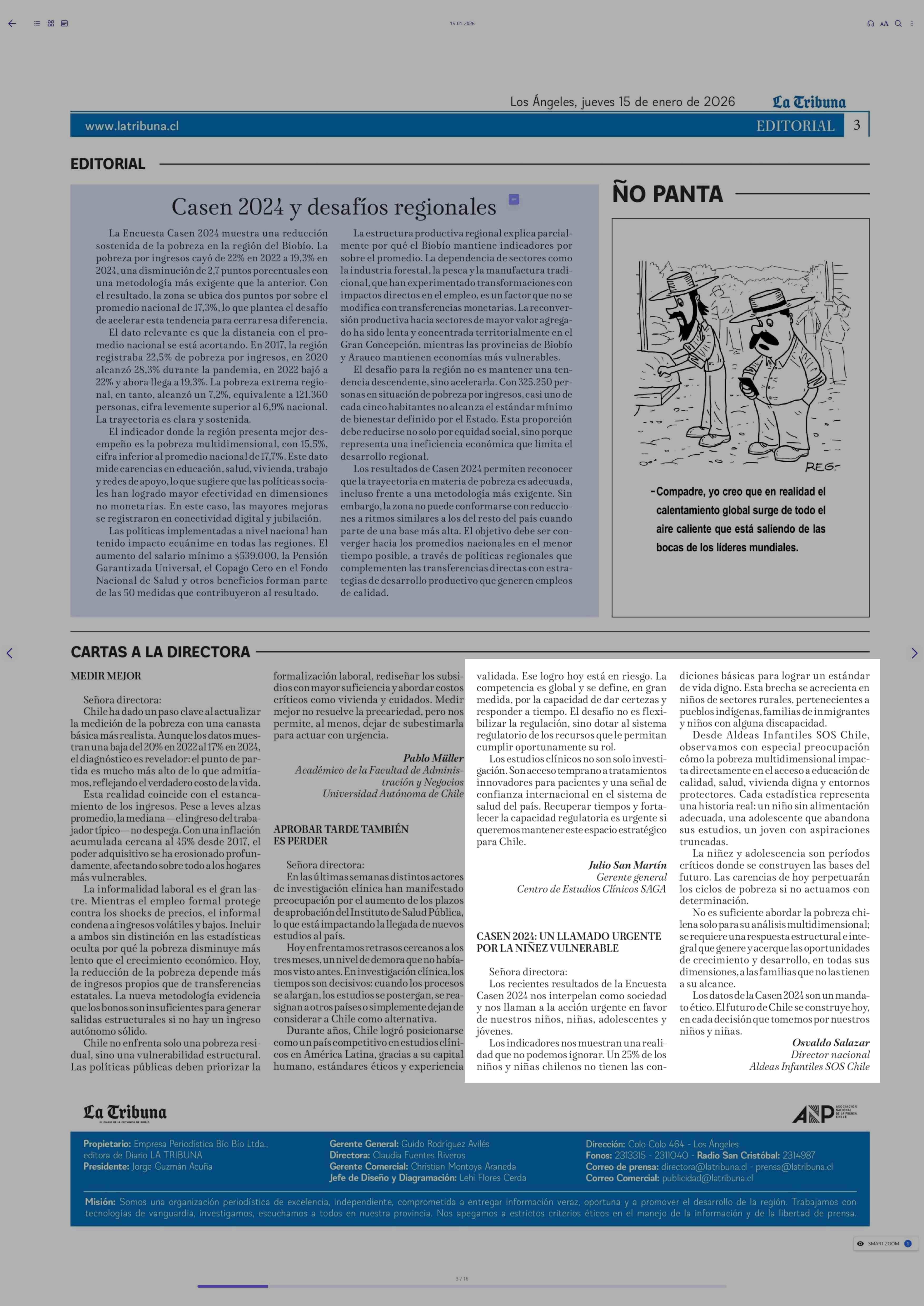 Cartas: CASEN 2024: UN LLAMADO URGENTE POR LA NIÑEZ VULNERABLE 15-01-2026 La Tribuna |