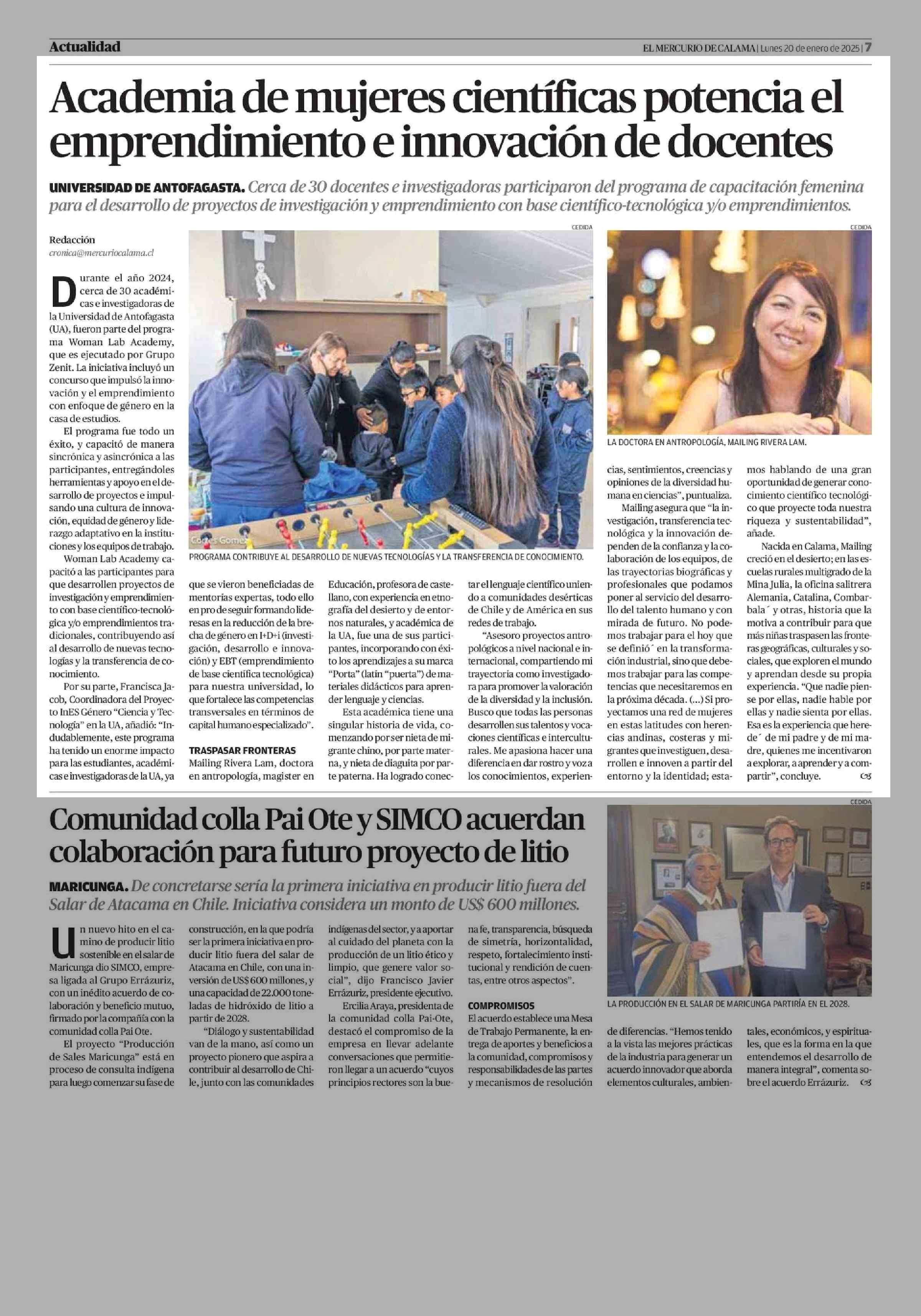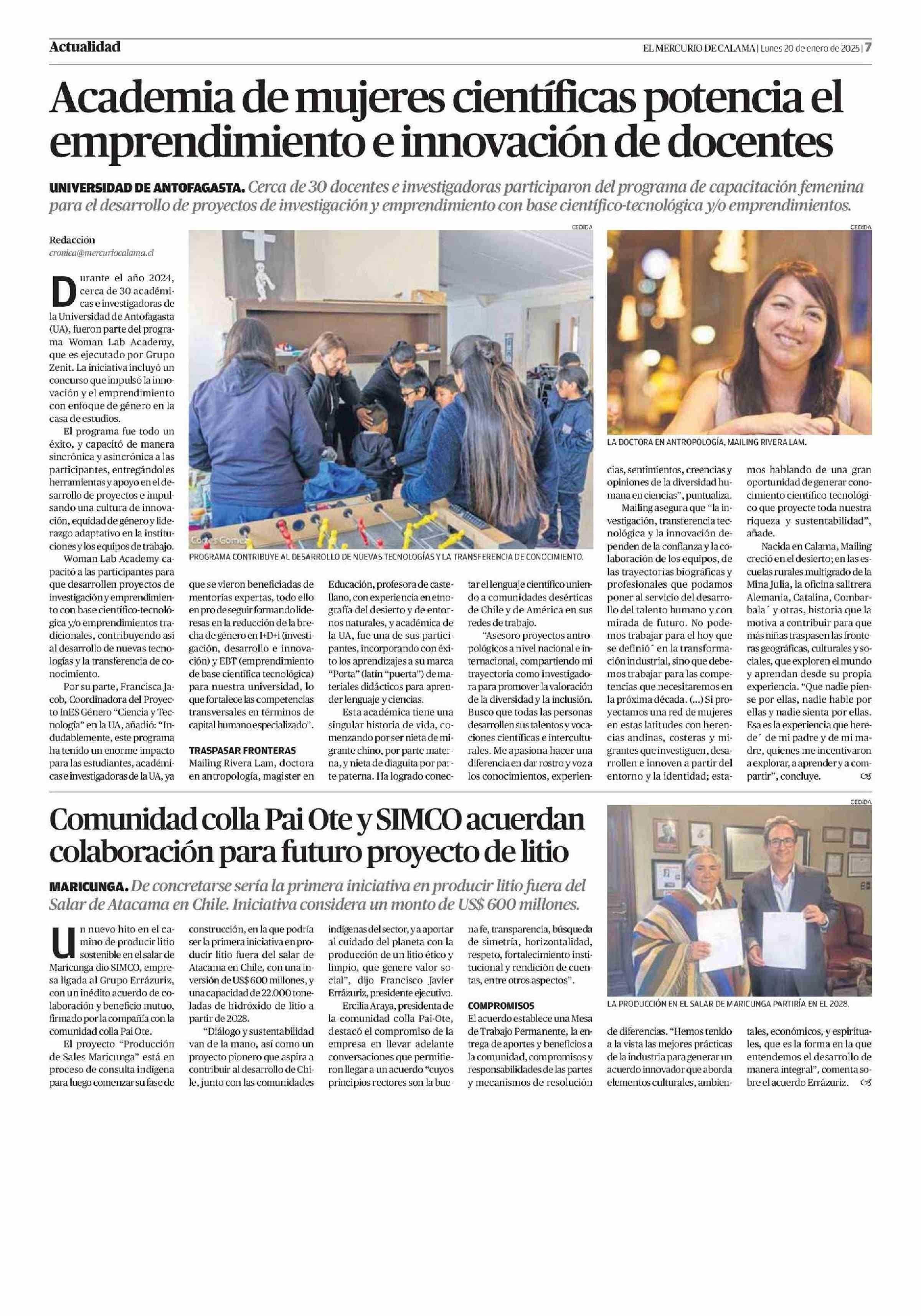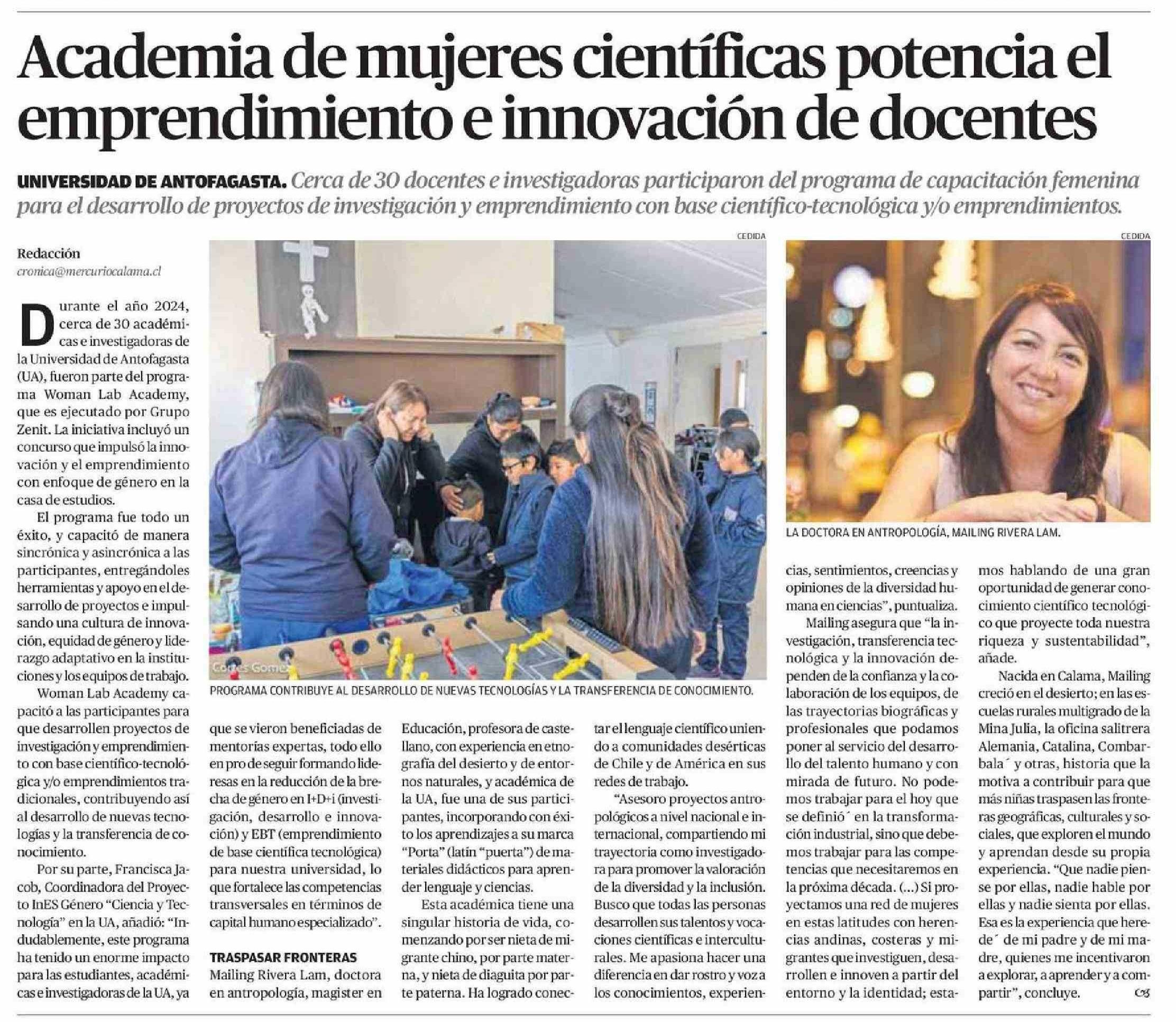 Academia de mujeres científicas potencia el emprendimiento e innovación de docentes 20-01-2025 El Mercurio de Calama |