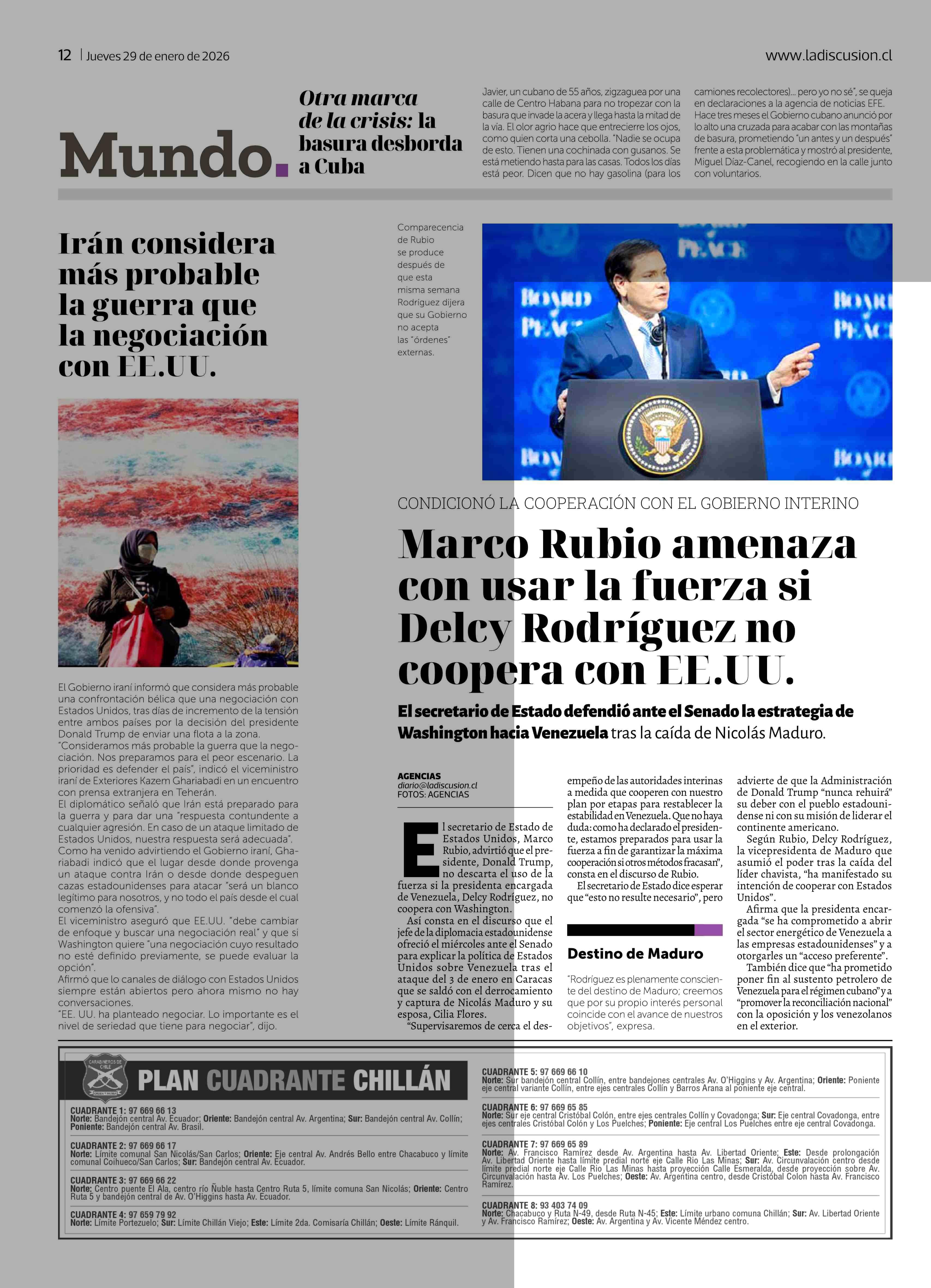 Marco Rubio amenaza con usar la fuerza si Delcy Rodríguez no coopera con EE.UU. 29-01-2026 La Discusión |