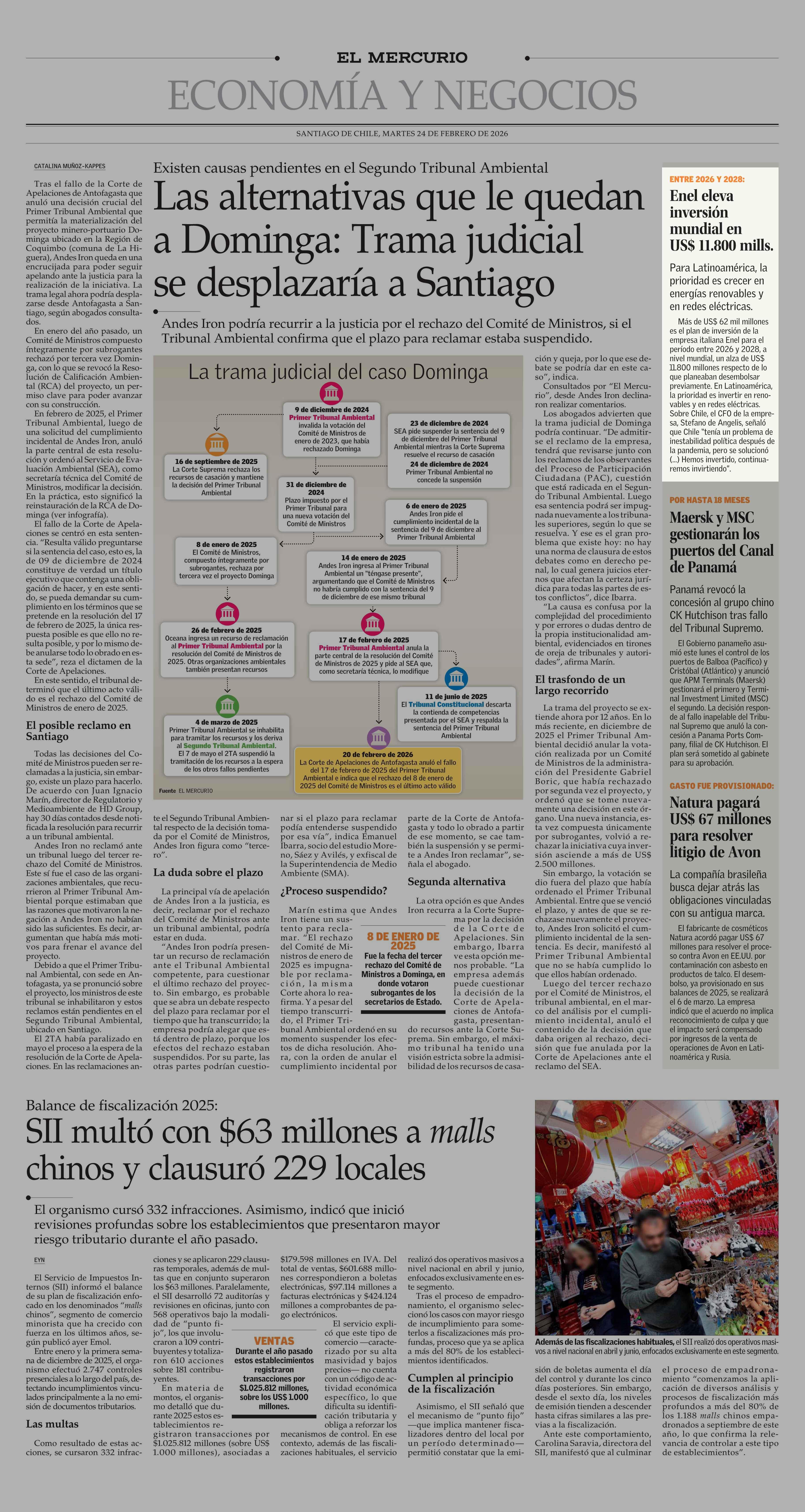 Enel eleva inversión mundial en US$ 11.800 mills. 24-02-2026 El Mercurio |