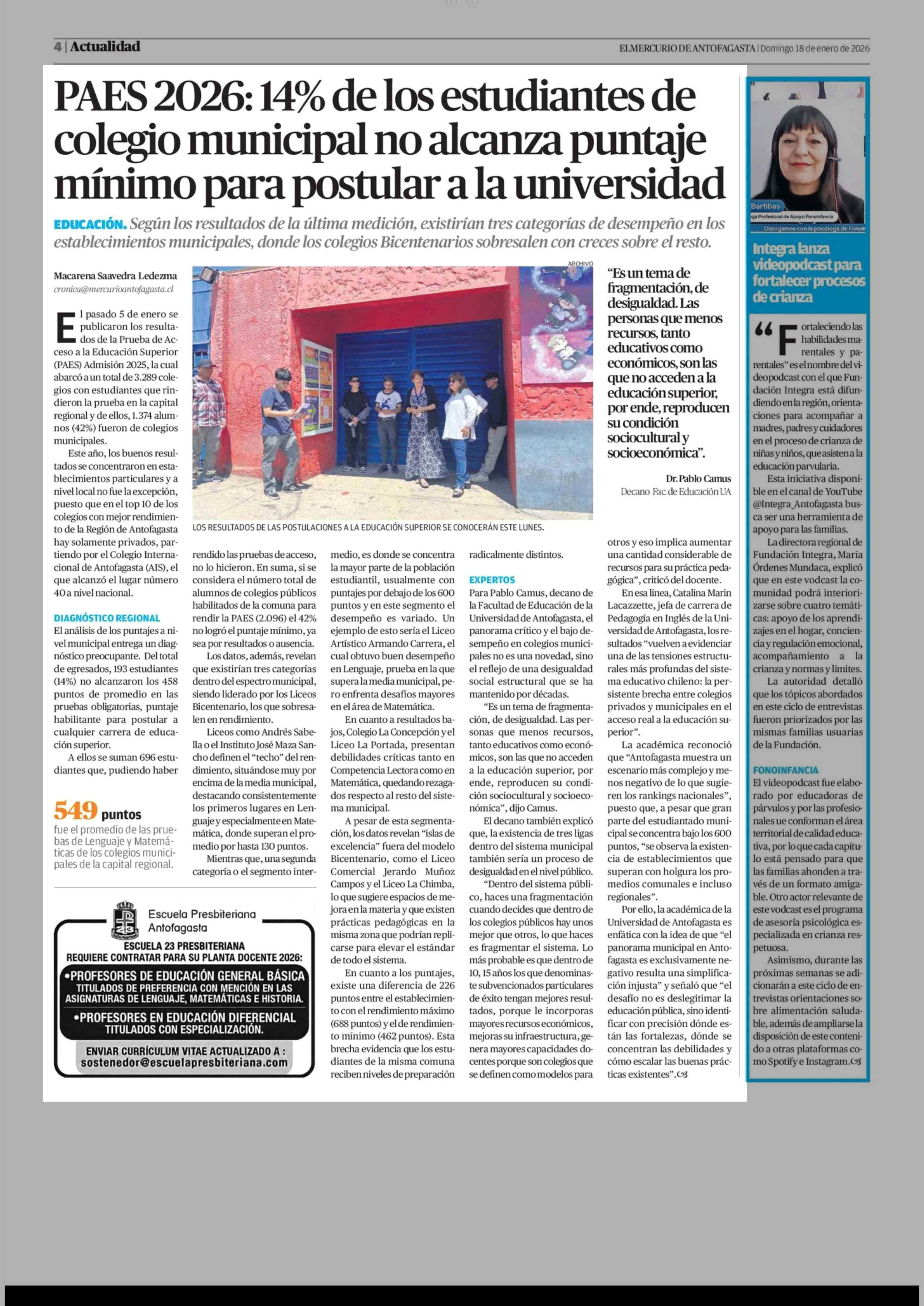 PAES 2026: 14% de los estudiantes de colegio municipal no alcanza puntaje mínimo para postular a la universidad 18-01-2026 El Mercurio de Antofagasta |