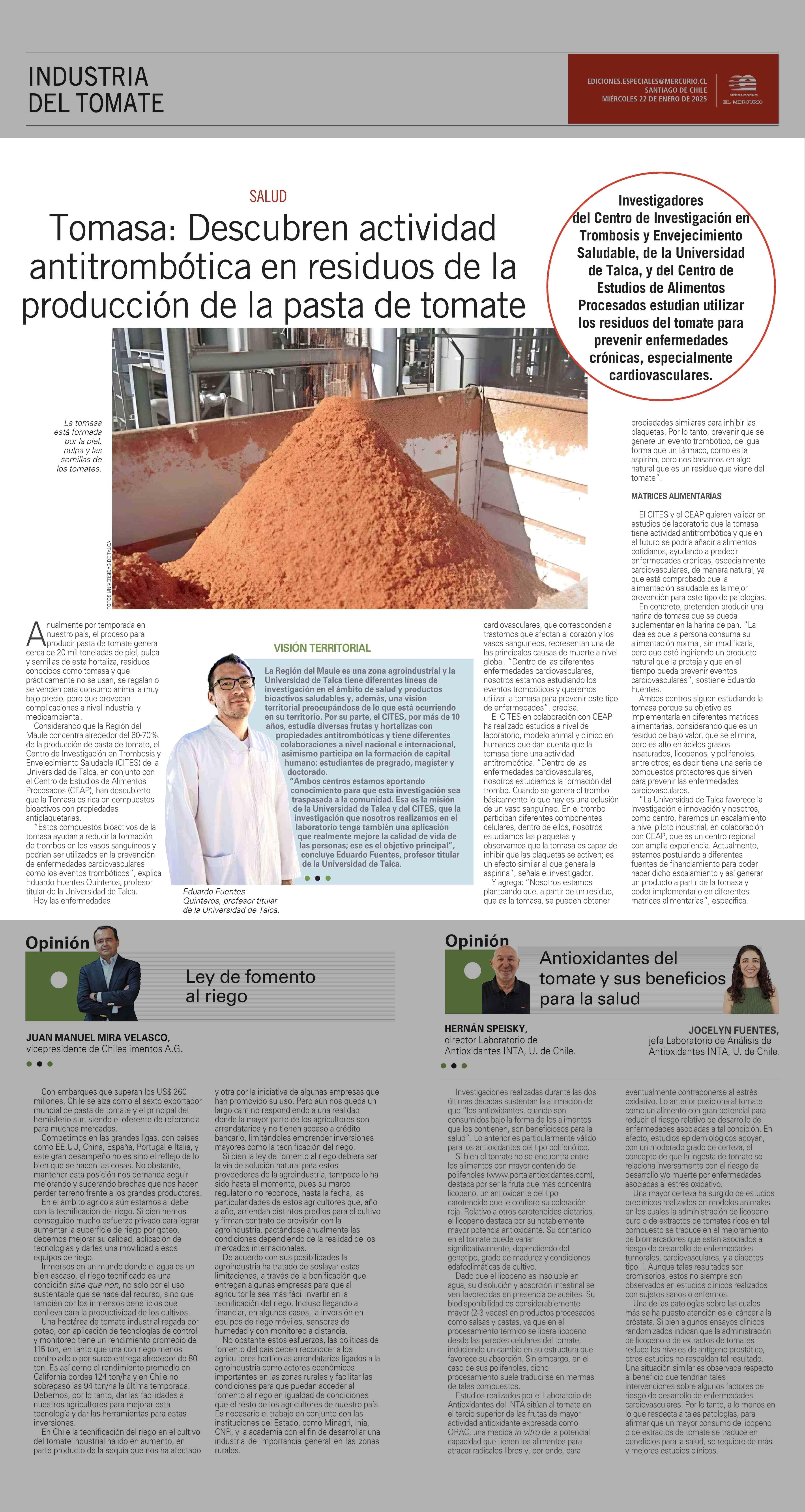 Tomasa: Descubren actividad antitrombótica en residuos de la producción de la pasta de tomate 22-01-2025 El Mercurio |