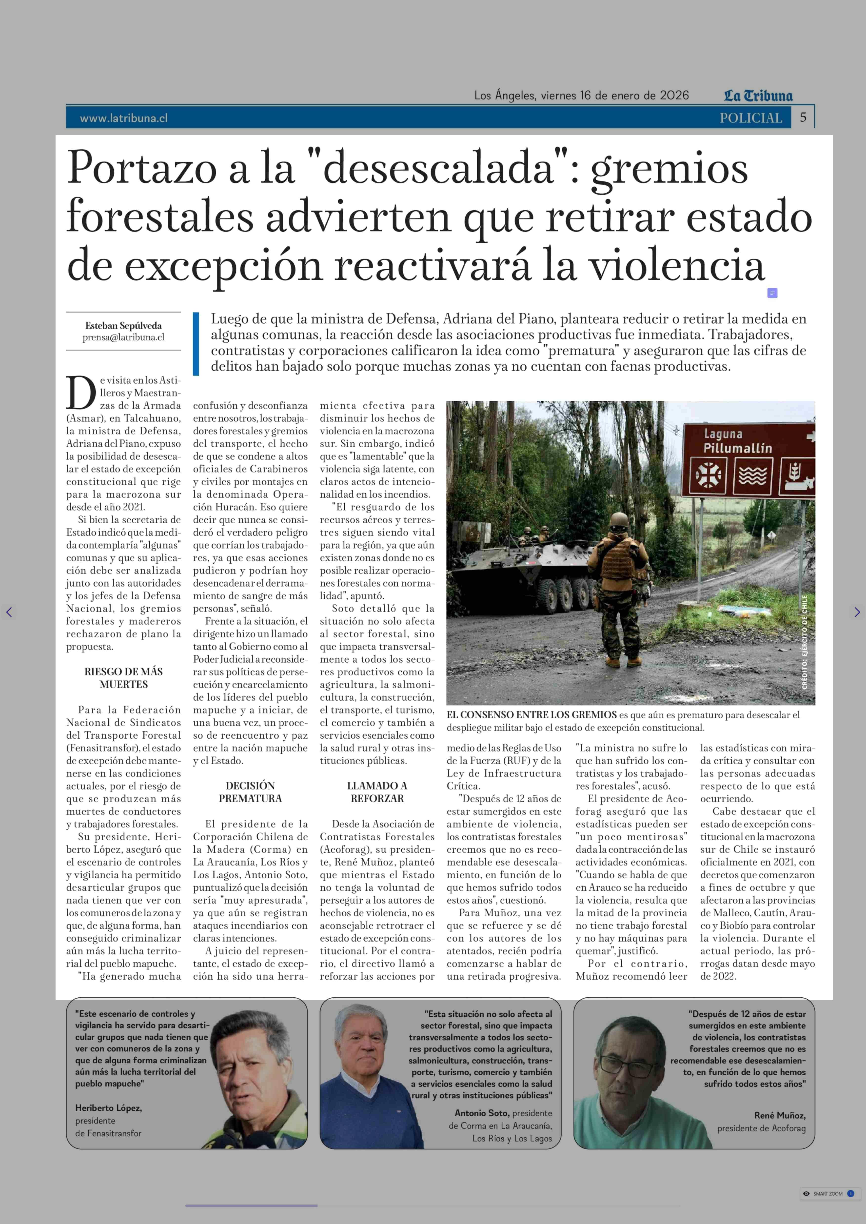 Portazo a la "desescalada": gremios forestales advierten que retirar estado de excepción reactivará la violencia 16-01-2026 La Tribuna |
