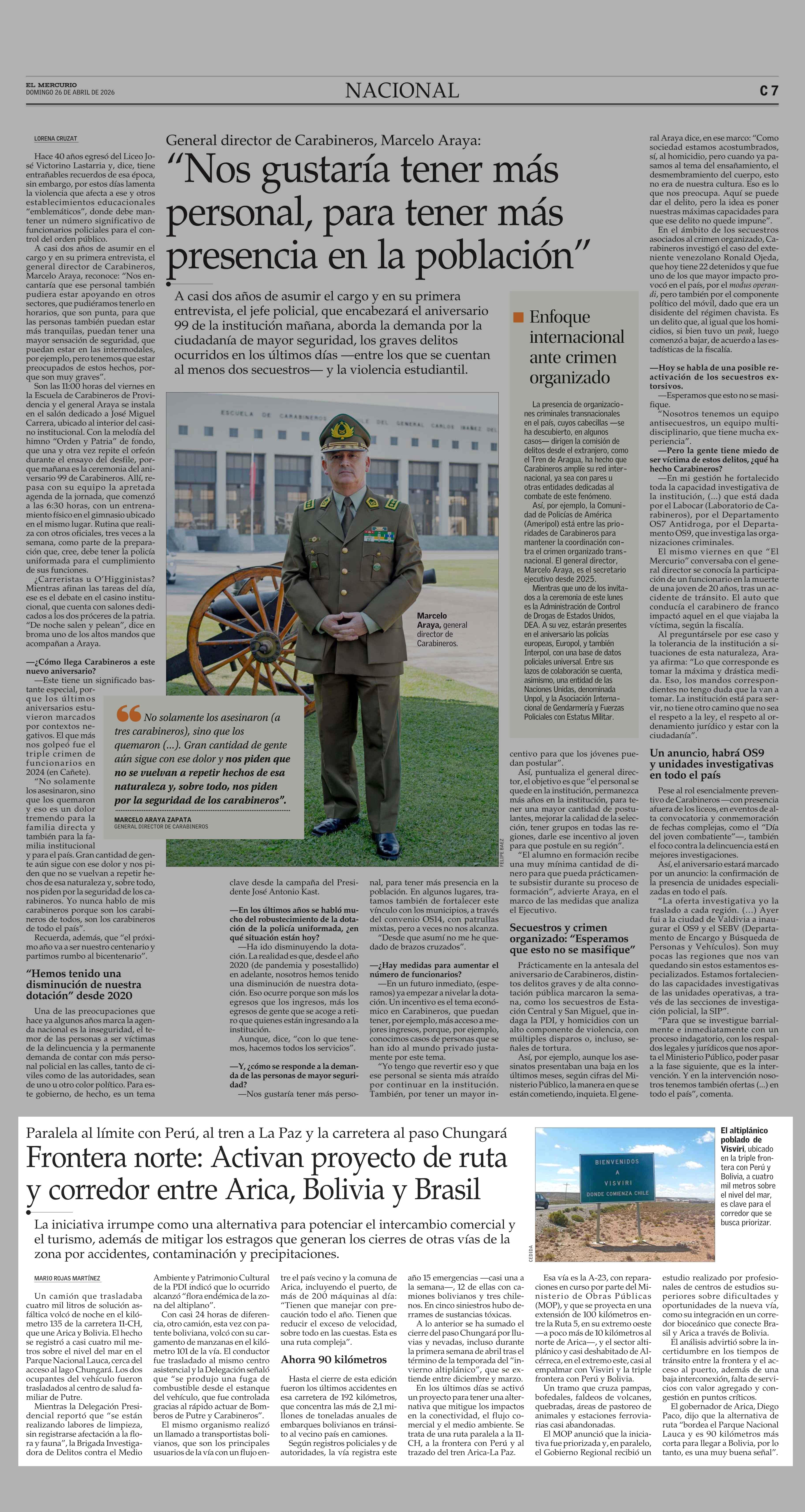 Frontera norte: Activan proyecto de ruta y corredor entre Arica, Bolivia y Brasil 26-04-2026 El Mercurio |