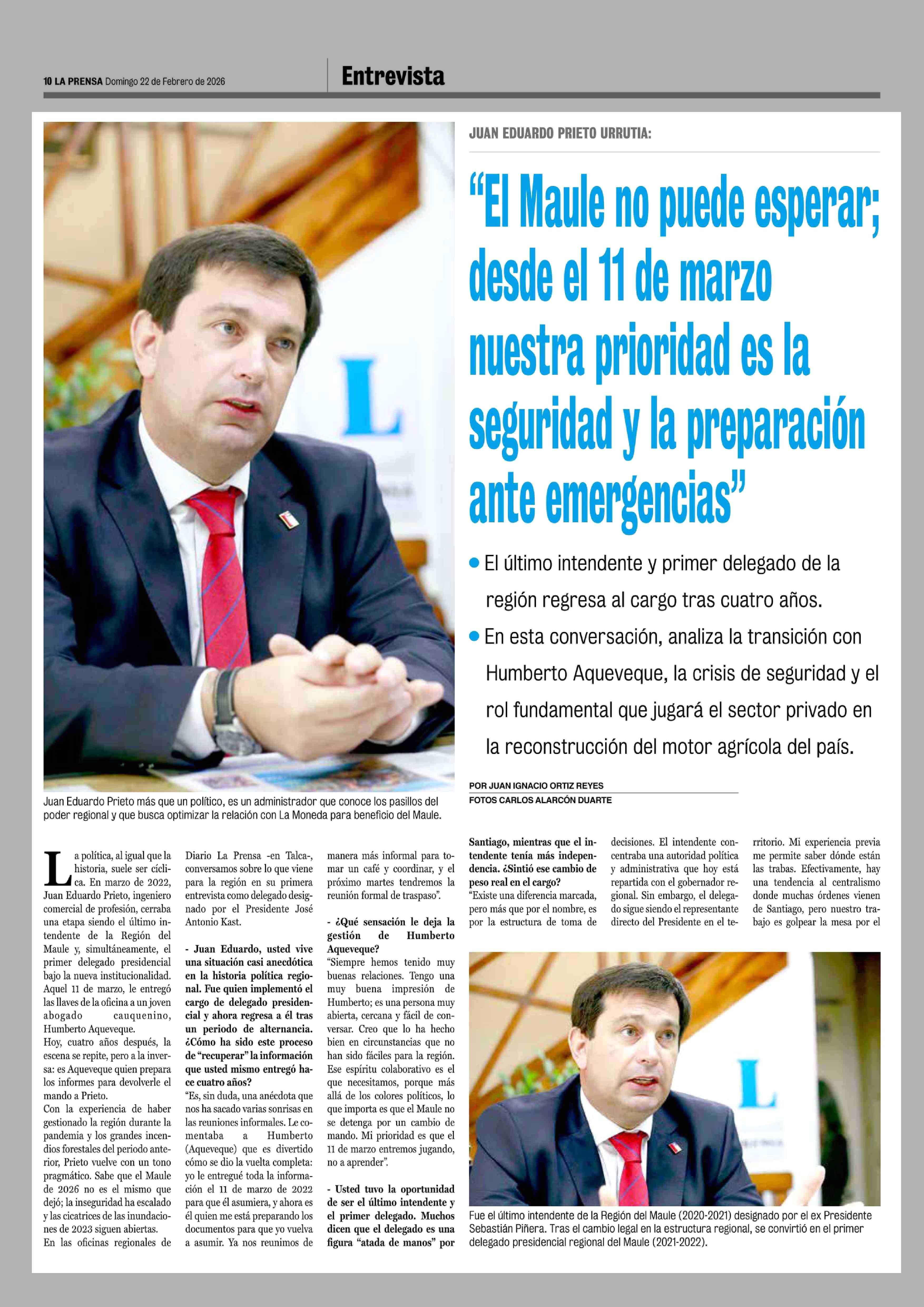 "El Maule no puede esperar; desde el 11 de marzo nuestra prioridad es la seguridad y la preparación ante emergencias" 22-02-2026 La Prensa de Curicó |