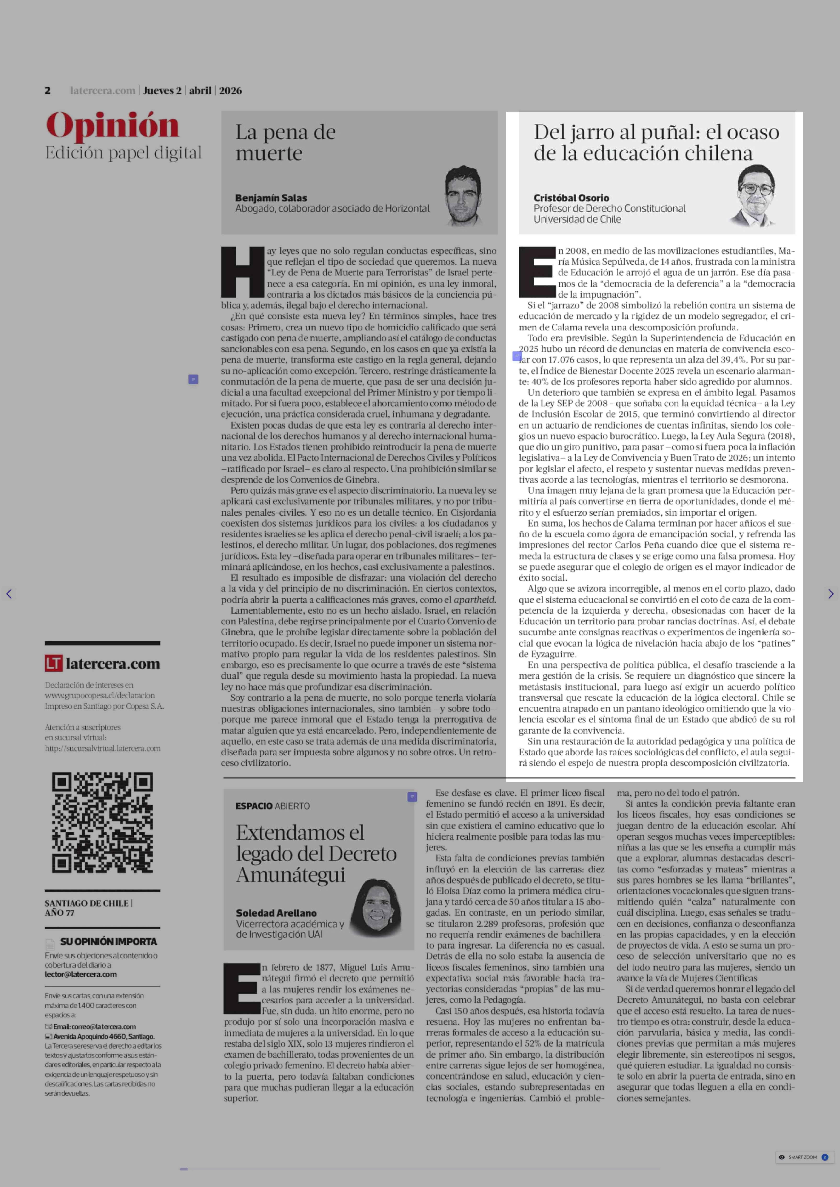 Columnas de Opinión: Del jarro al puñal: el ocaso de la educación chilena 02-04-2026 La Tercera |