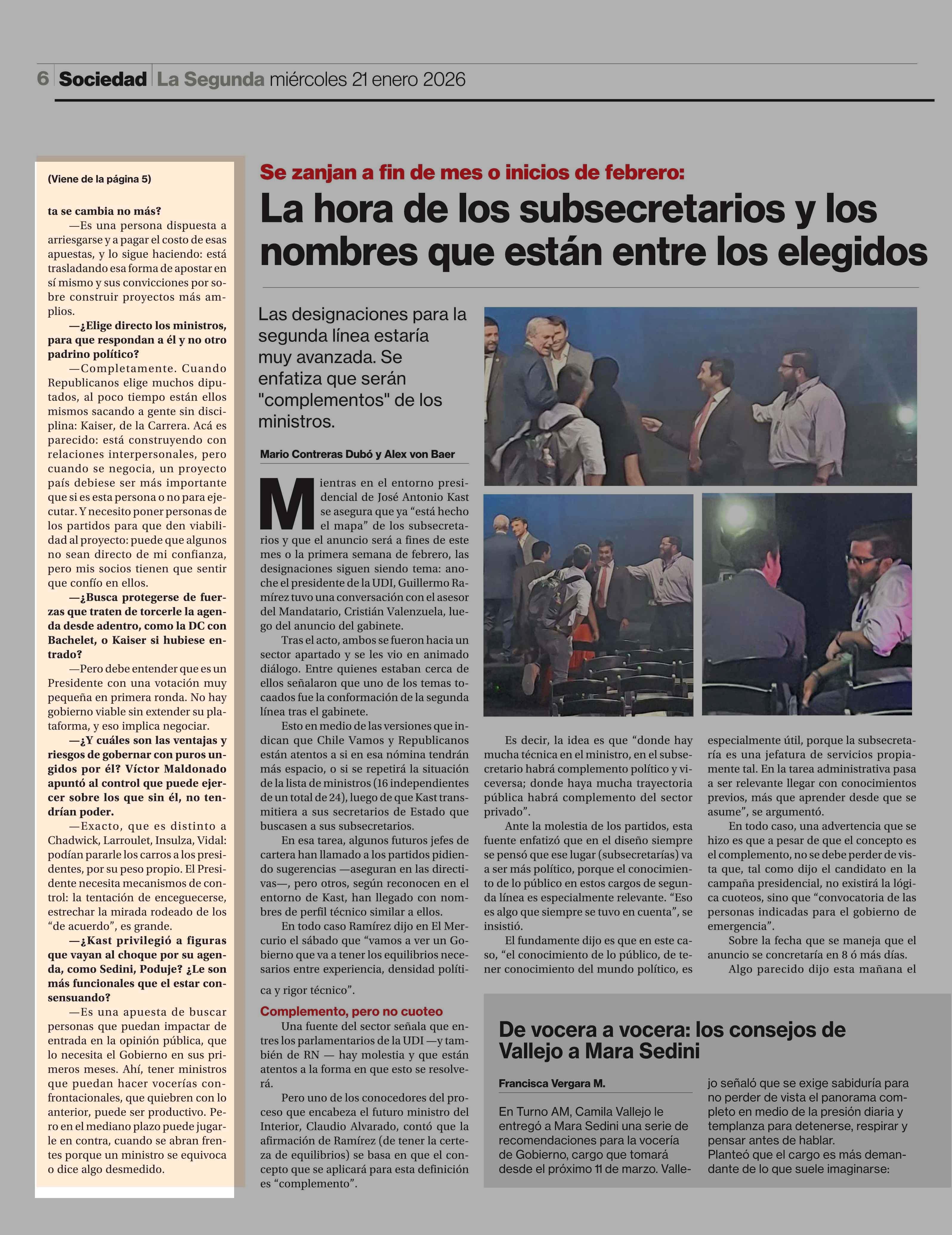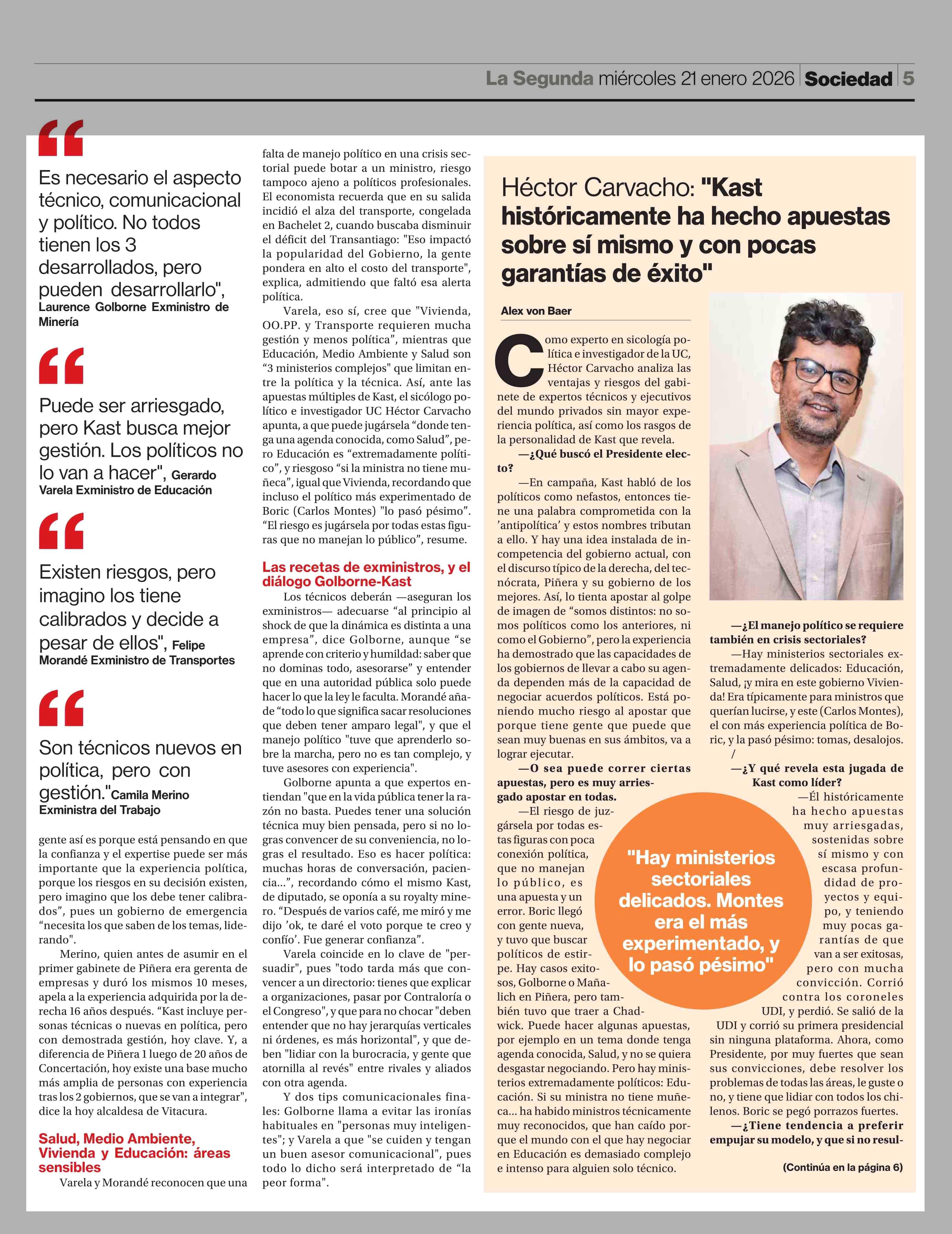 Varela, Golborne, Merino y Morandé reconocen los riesgos de ser ministro "novato en política" 21-01-2026 La Segunda |