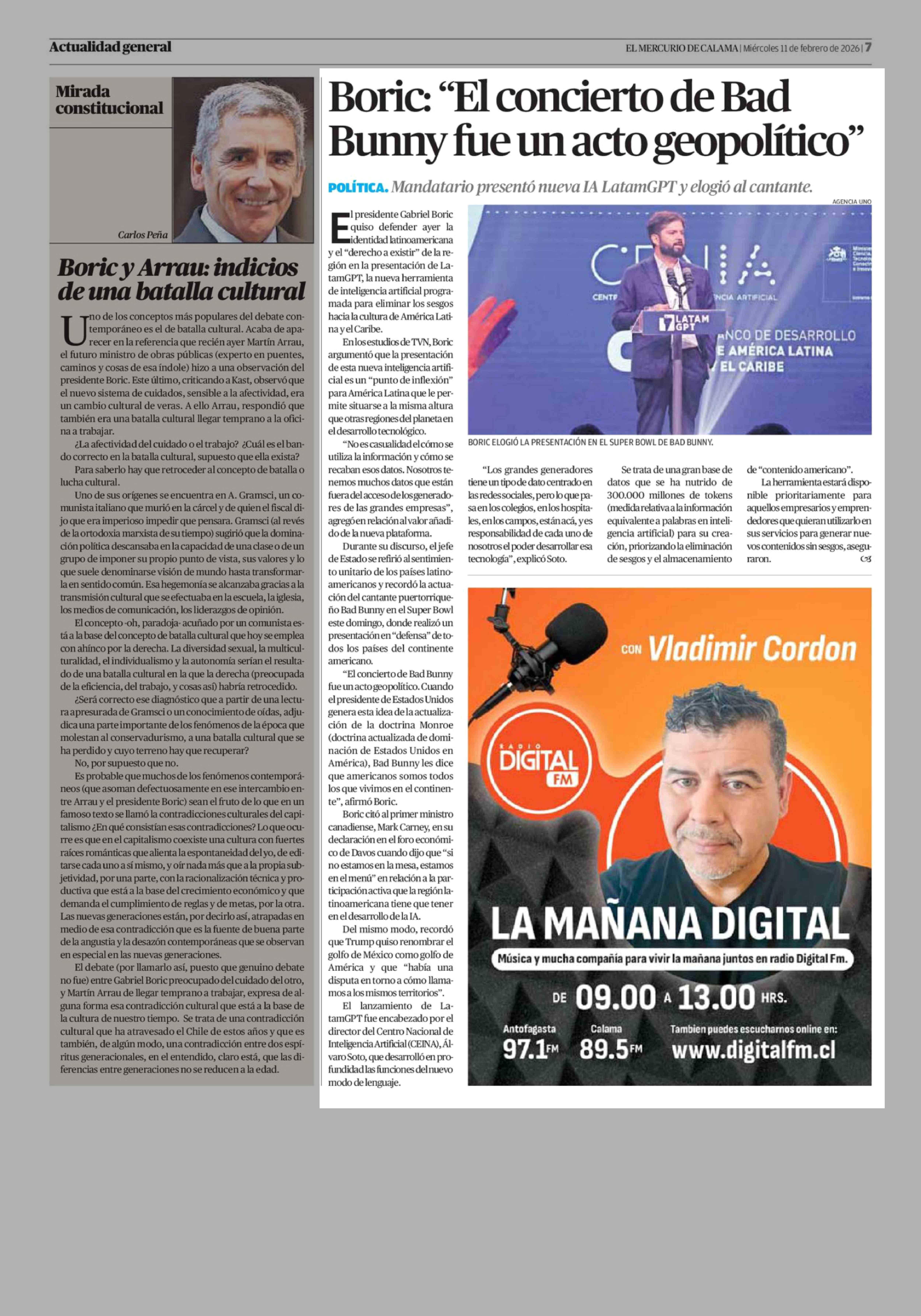 Boric: "El concierto de Bad Bunny fue un acto geopolítico" 11-02-2026 El Mercurio de Calama |