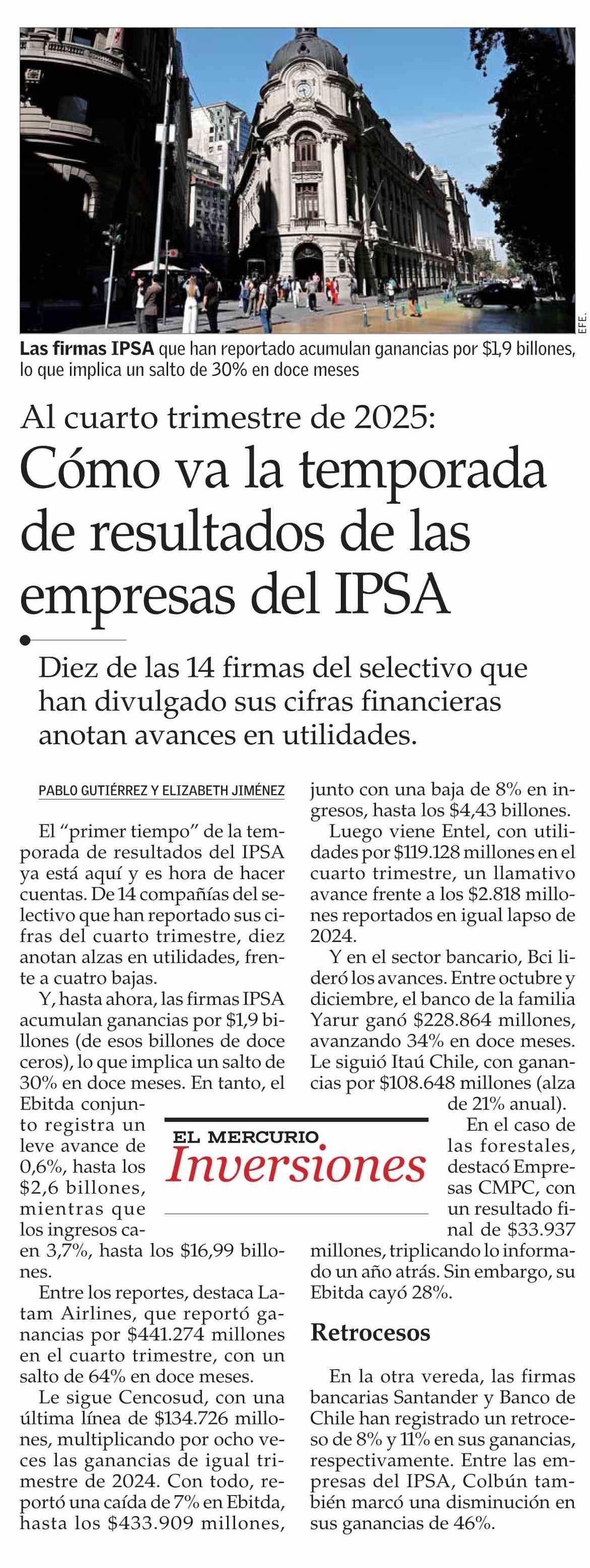 Cómo va la temporada de resultados de las empresas del IPSA 09-02-2026 El Mercurio |