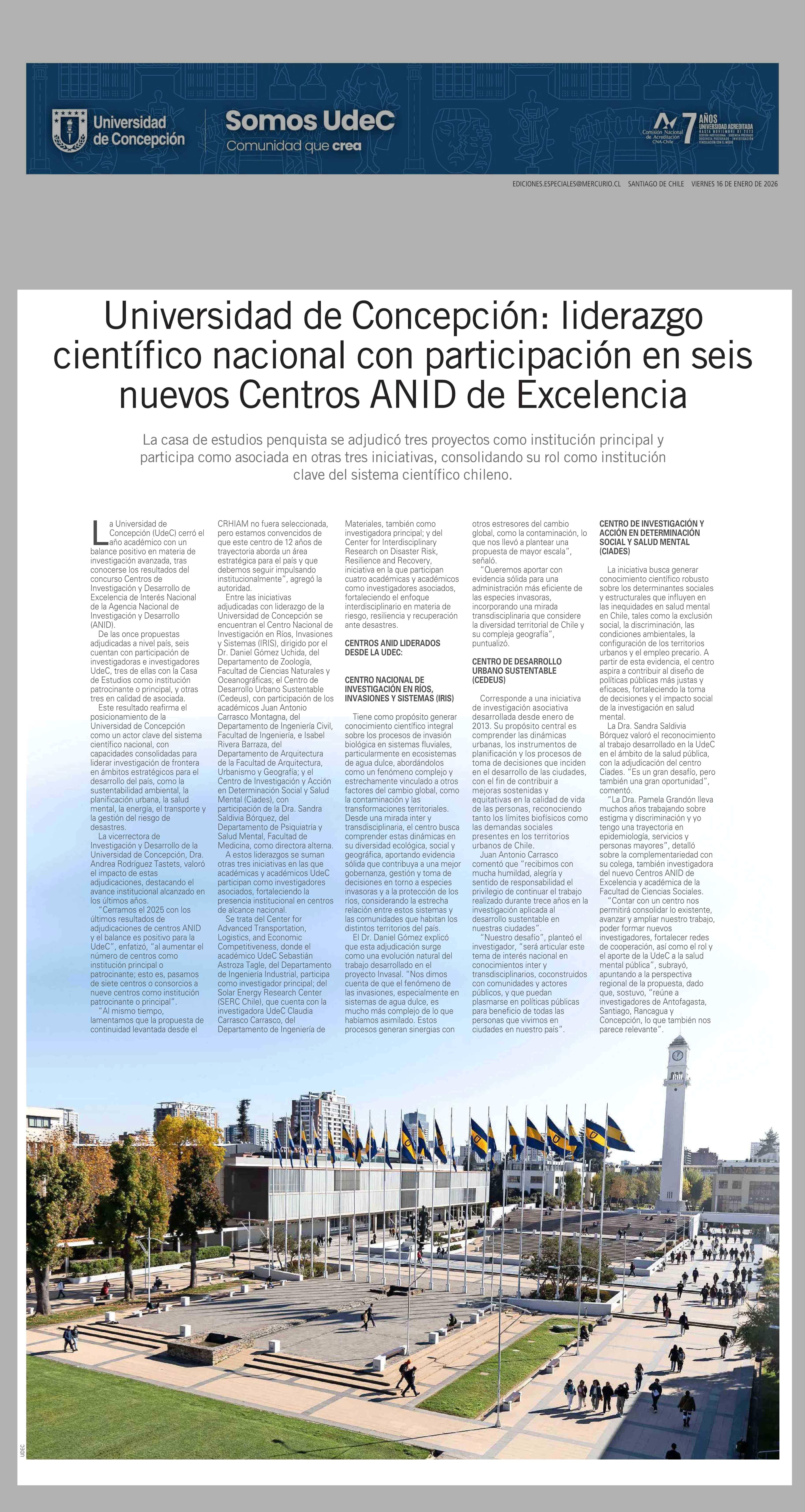 Universidad de Concepción: liderazgo científico nacional con participación en seis nuevos Centros ANID de Excelencia 16-01-2026 El Mercurio |