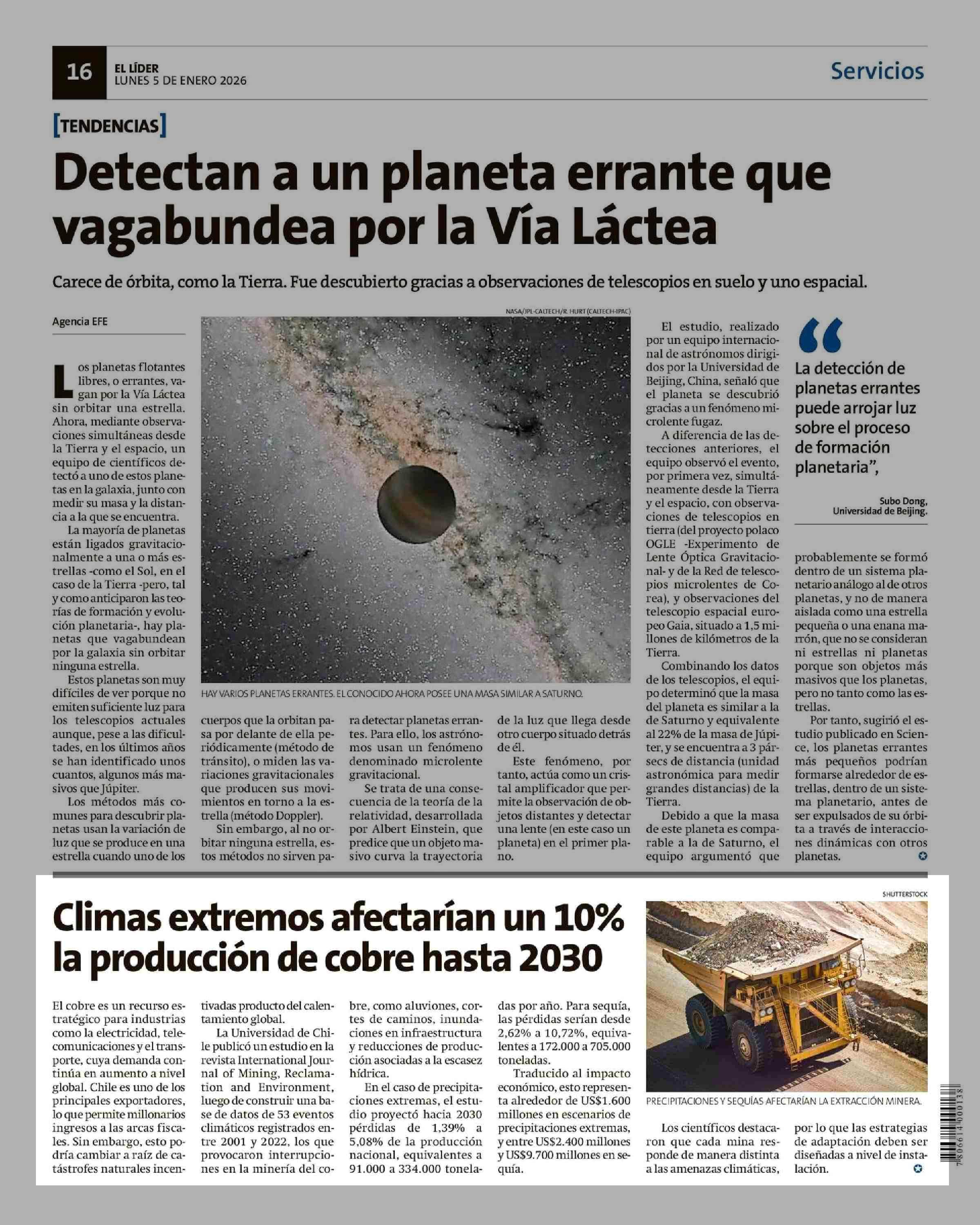 Climas extremos afectarían un 10% la producción de cobre hasta 2030 05-01-2026 El Líder |