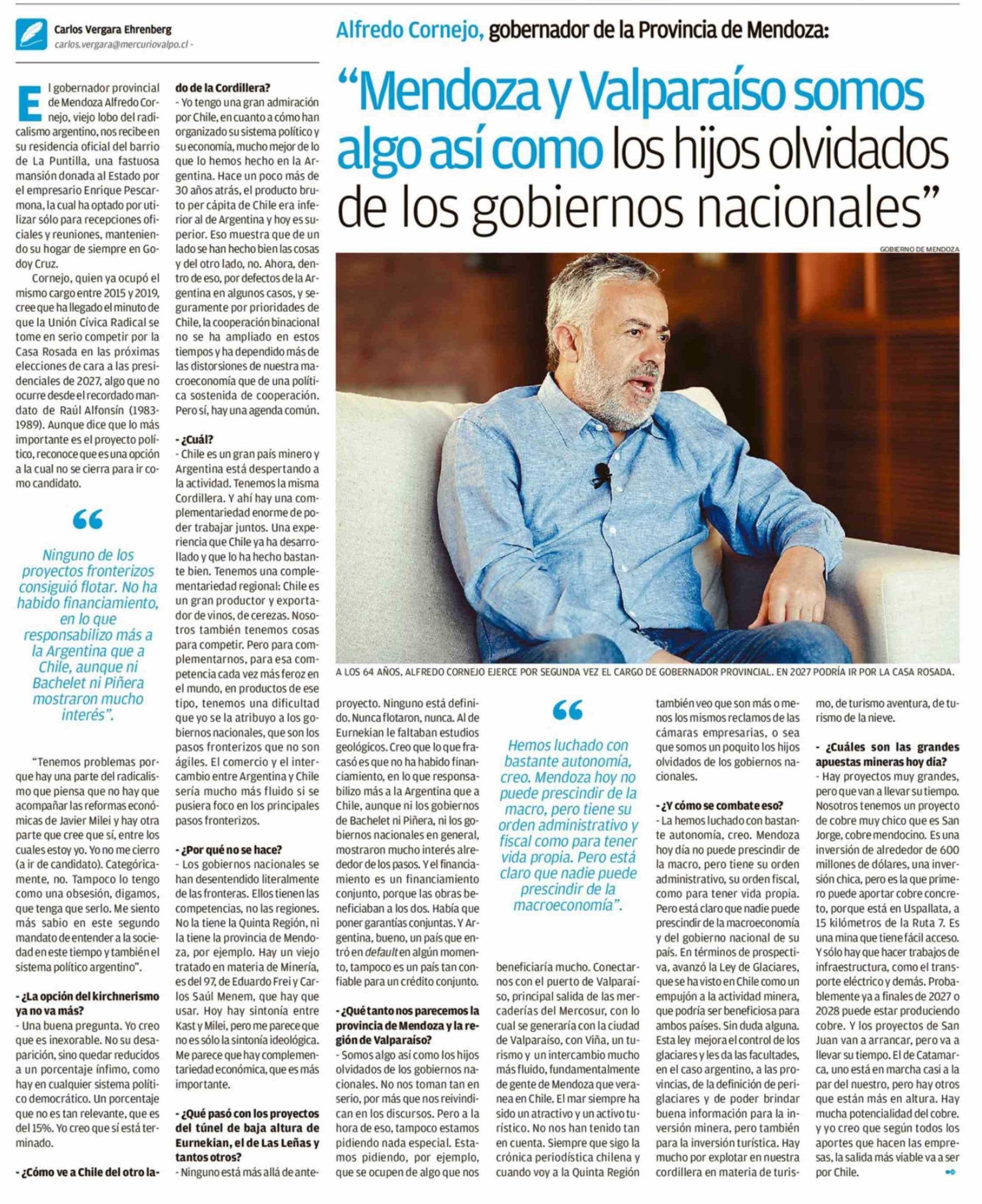 "Mendoza y Valparaíso somos algo así como los hijos olvidados de los gobiernos nacionales" 19-04-2026 El Mercurio de Valparaíso |