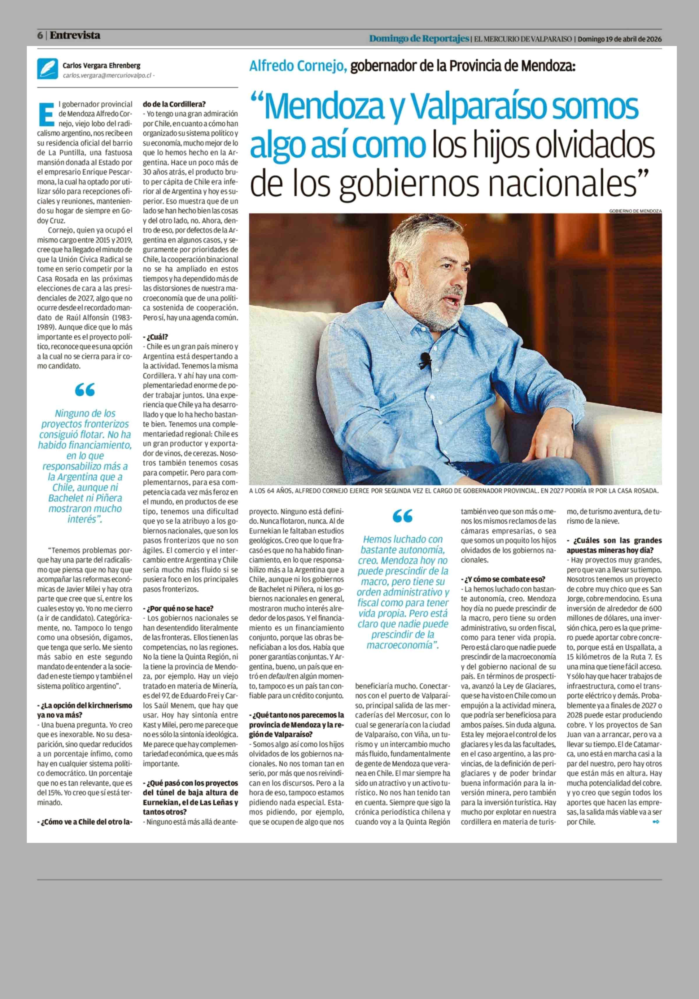 Título: "Mendoza y Valparaíso somos algo así como los hijos olvidados de los gobiernos nacionales"