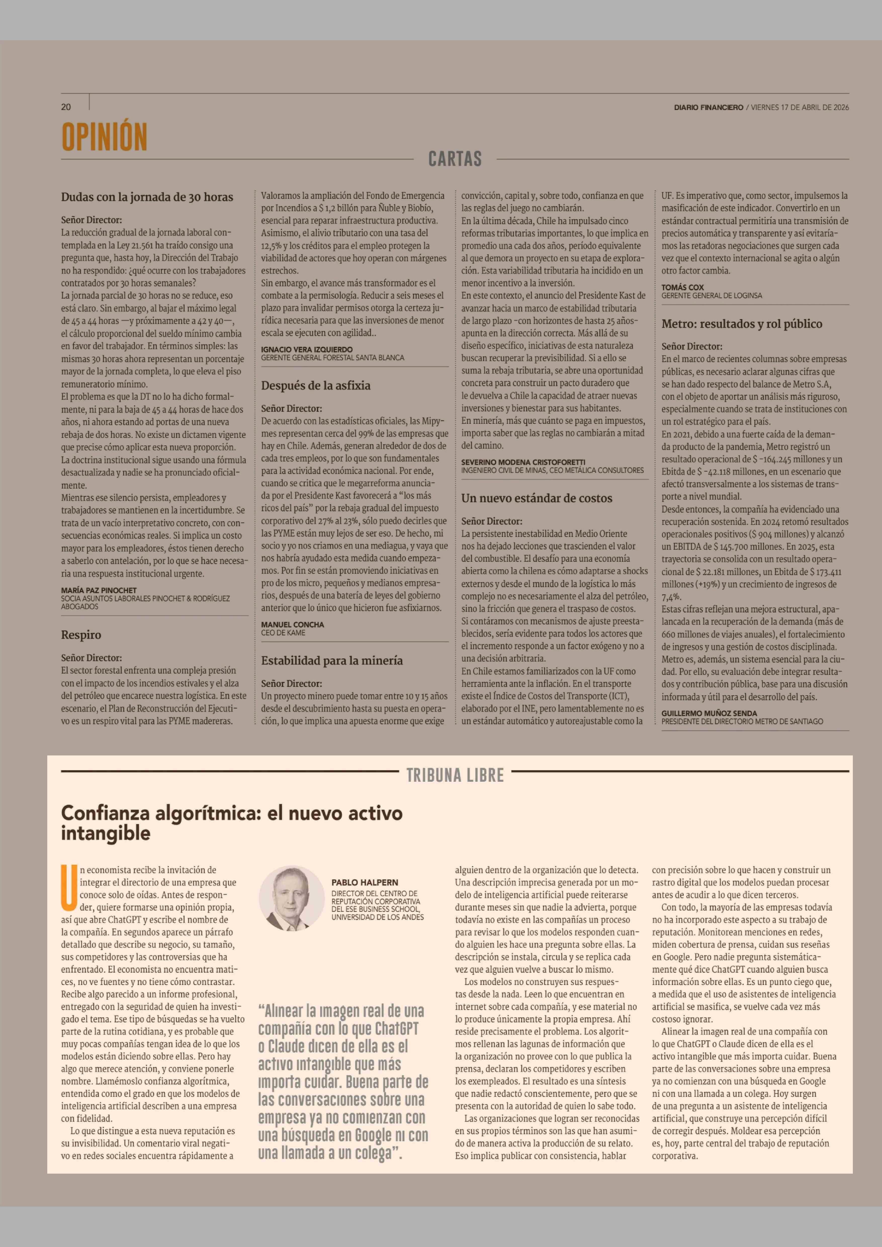 Columnas de Opinión: Confianza algorítmica: el nuevo activo intangible 17-04-2026 Diario Financiero |