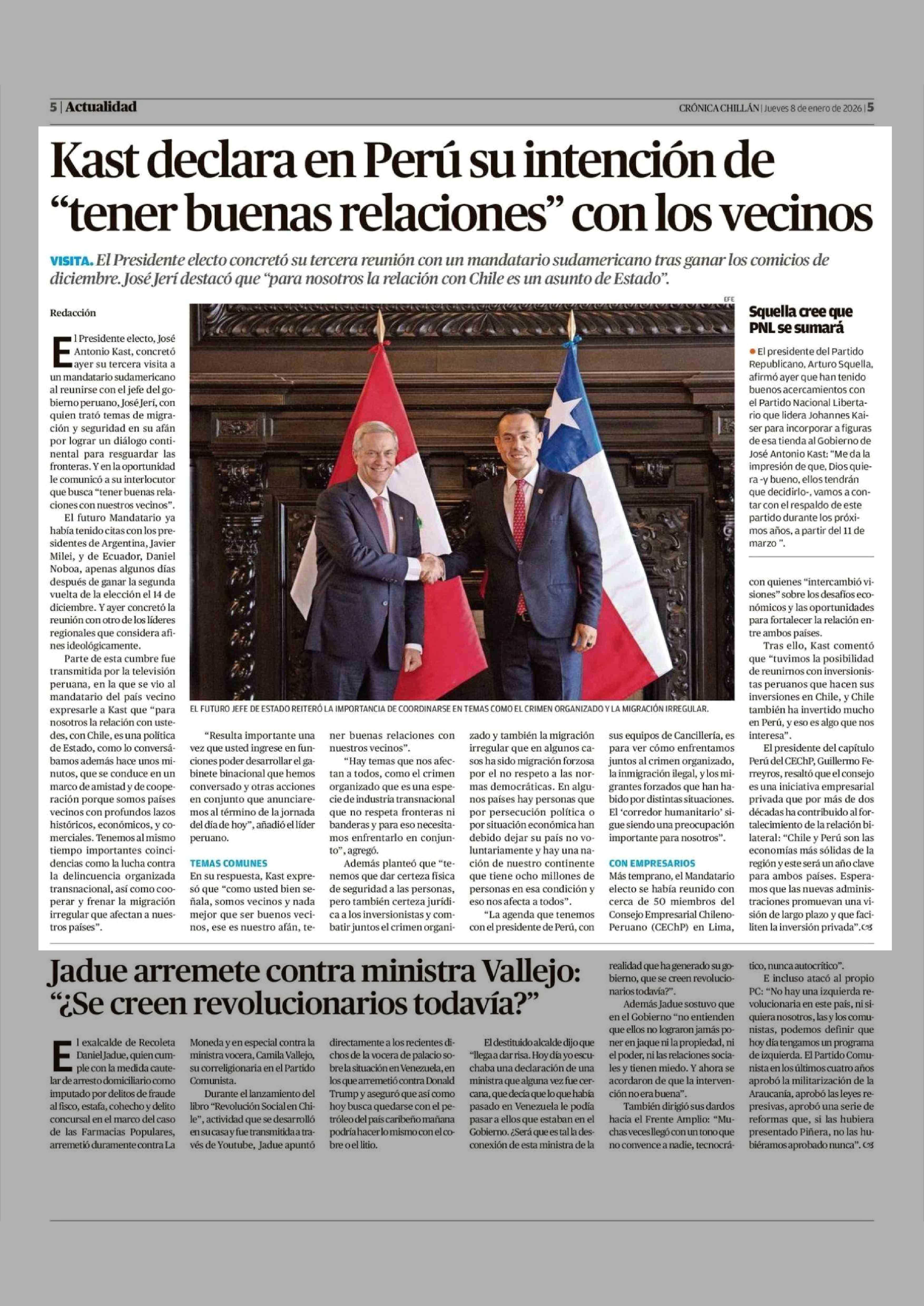 Título: Kast declara en Perú su intención de "tener buenas relaciones" con los vecinos