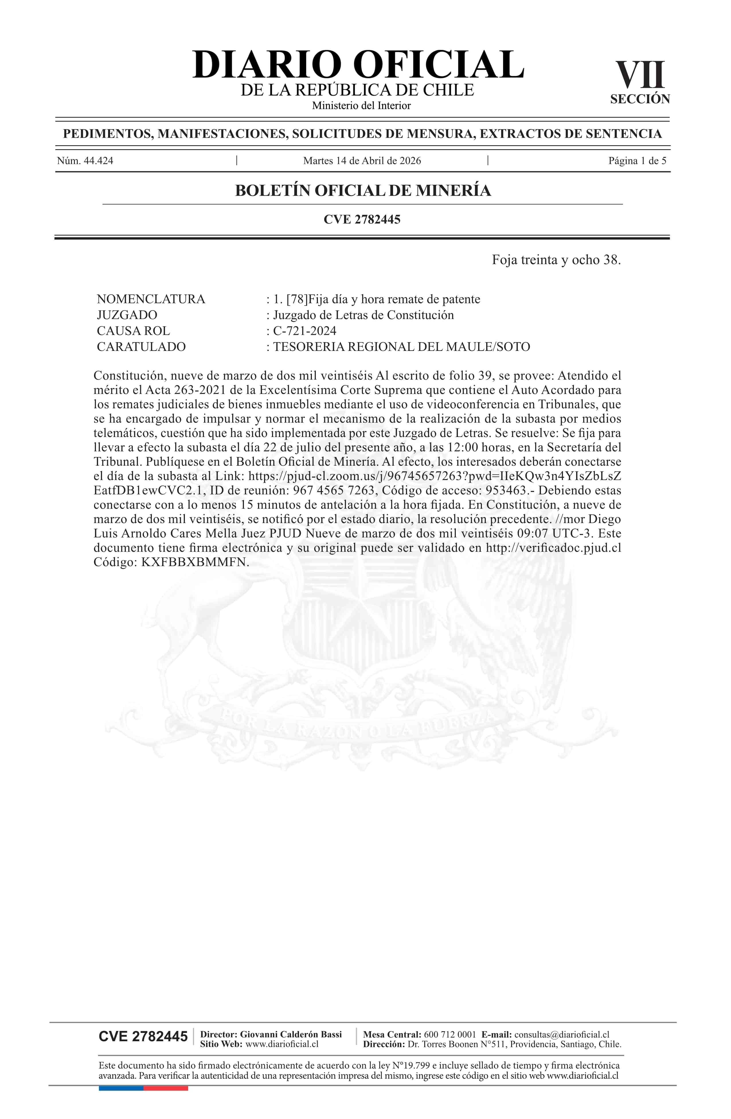 Fuente: DIARIO OFICIAL CHILE - BOLETÍN OFICIAL DE MINERÍA (DIARIO OFICIAL CHILE – BOM – NÓMINA REMATE) Página(s): 1-5