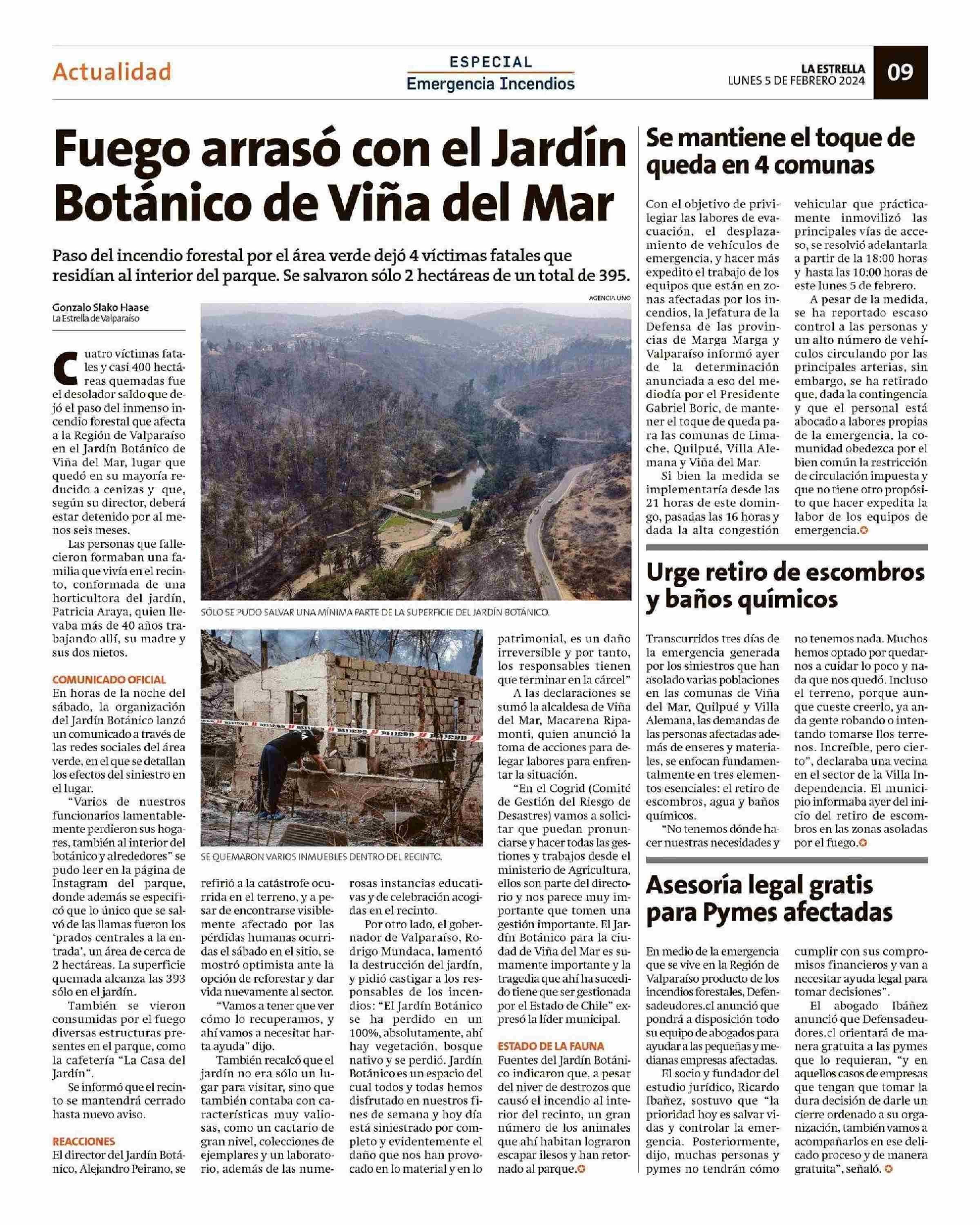 Fuego arrasó con el Jardín Botánico de Viña del Mar 05-02-2024 La Estrella de Valparaíso |