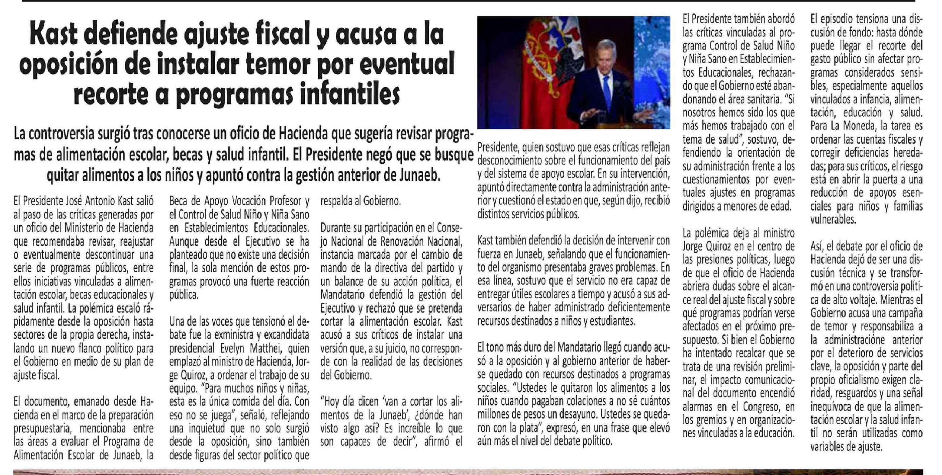 Título: Kast defiende ajuste fiscal y acusa a la oposición de instalar temor por eventual recorte a programas infantiles