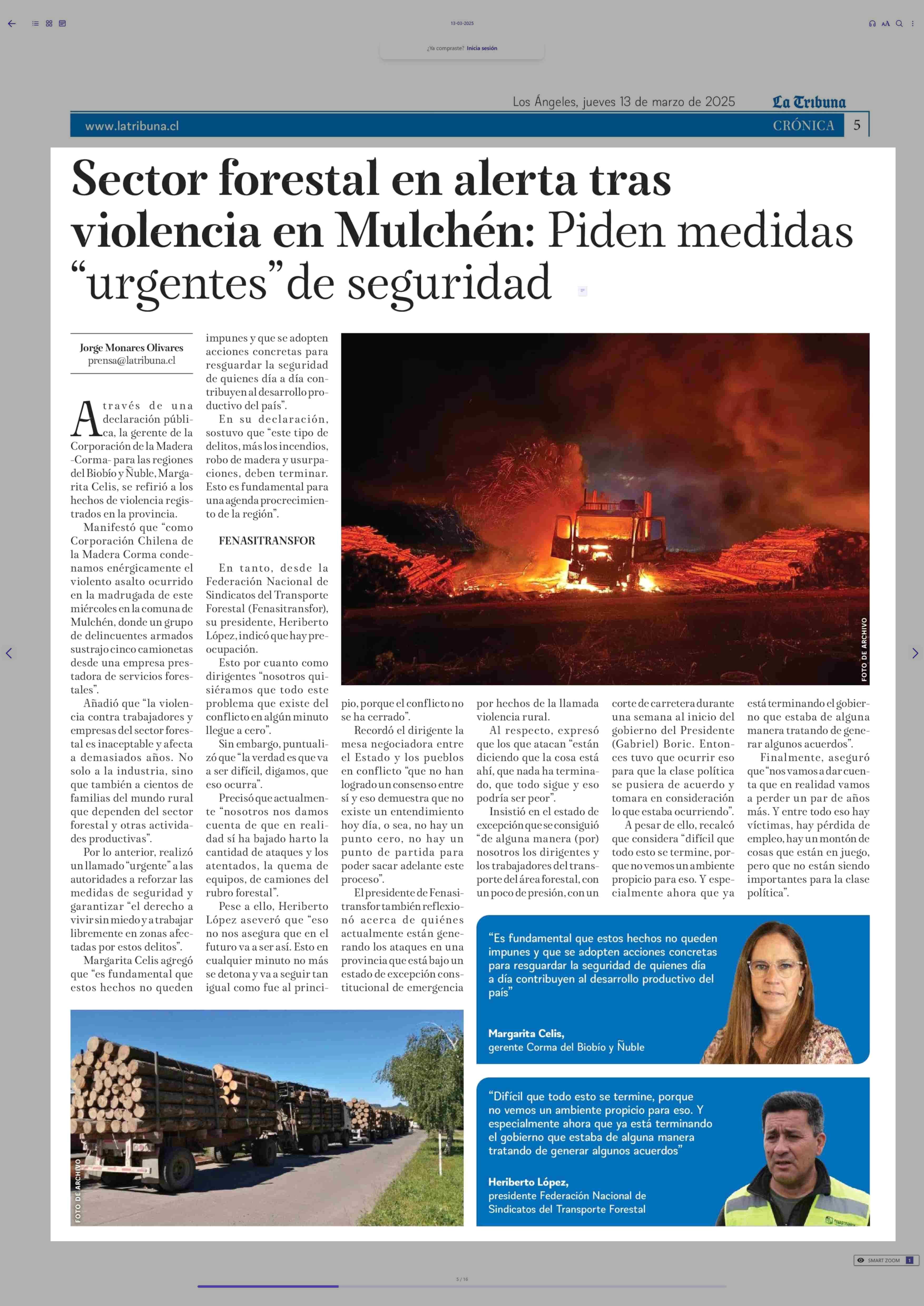 Sector forestal en alerta tras violencia en Mulchén: Piden medidas “urgentes de seguridad 13-03-2025 La Tribuna |