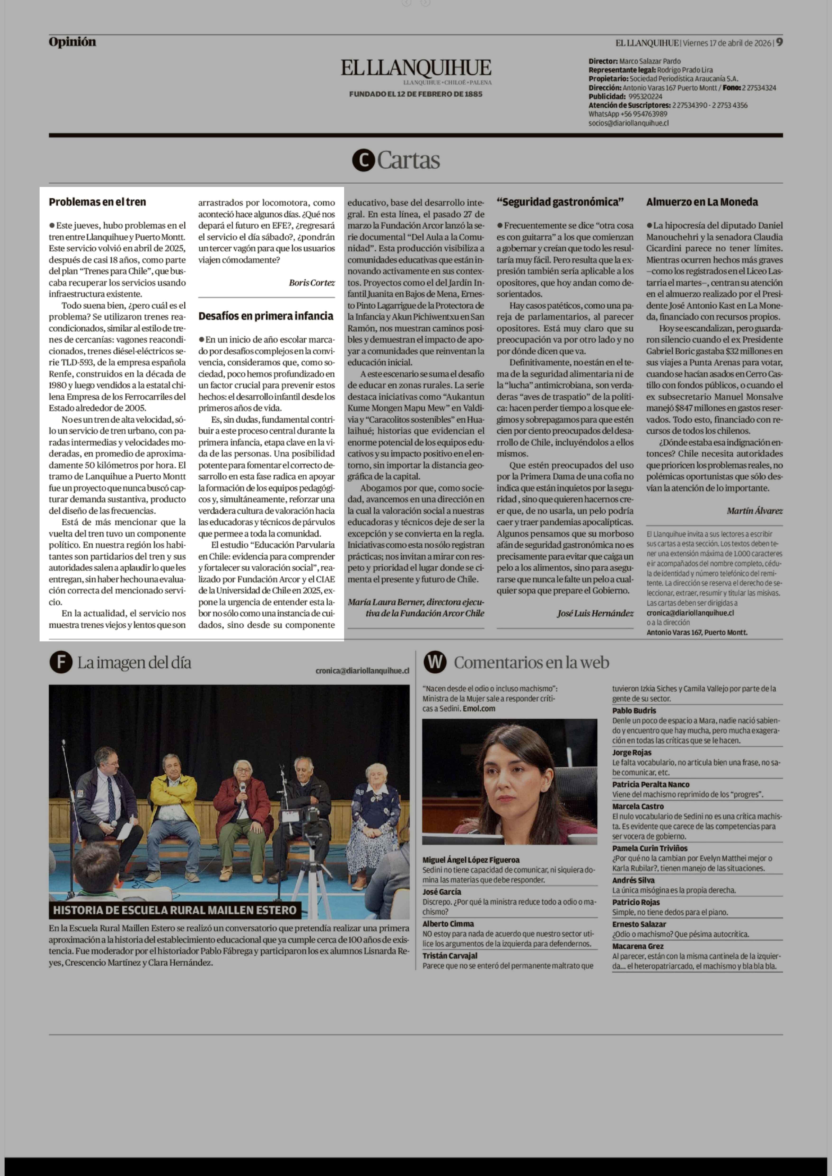 Cartas: Problemas en el tren 17-04-2026 El Llanquihue |