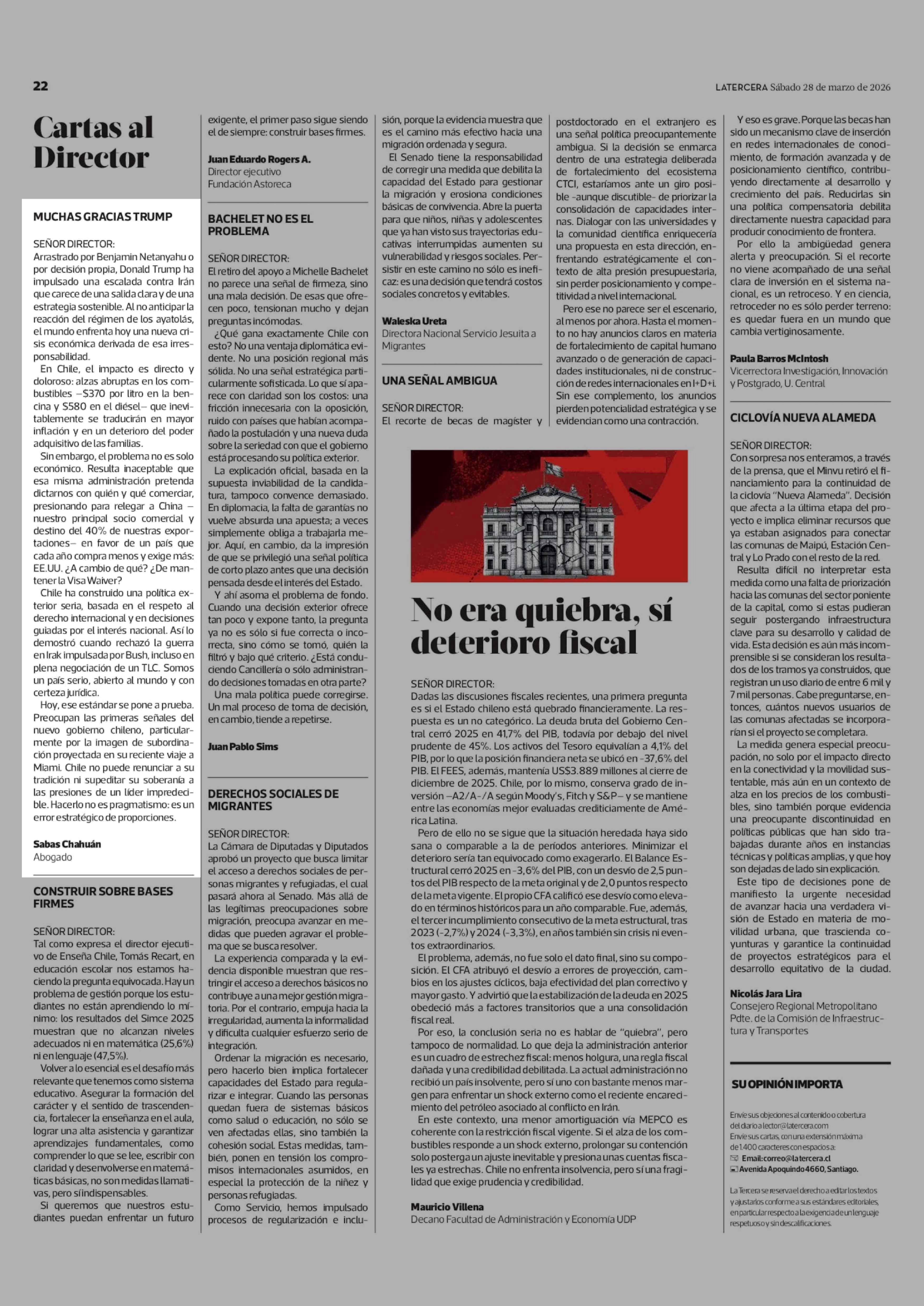 Cartas: MUCHAS GRACIAS TRUMP 28-03-2026 La Tercera |