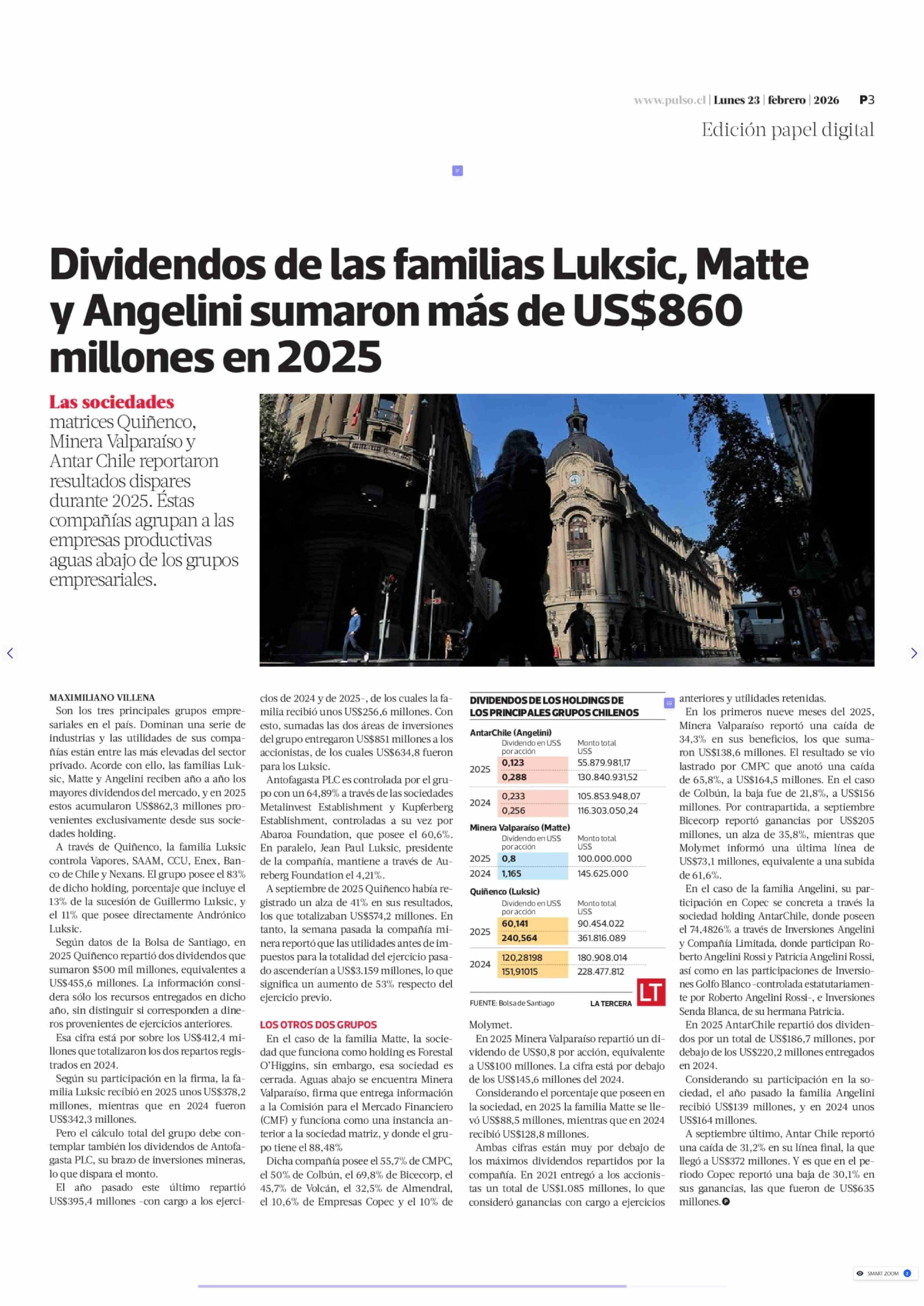 Dividendos de las familias Luksic, Matte y Angelini sumaron más de US$860 millones en 2025 23-02-2026 La Tercera |