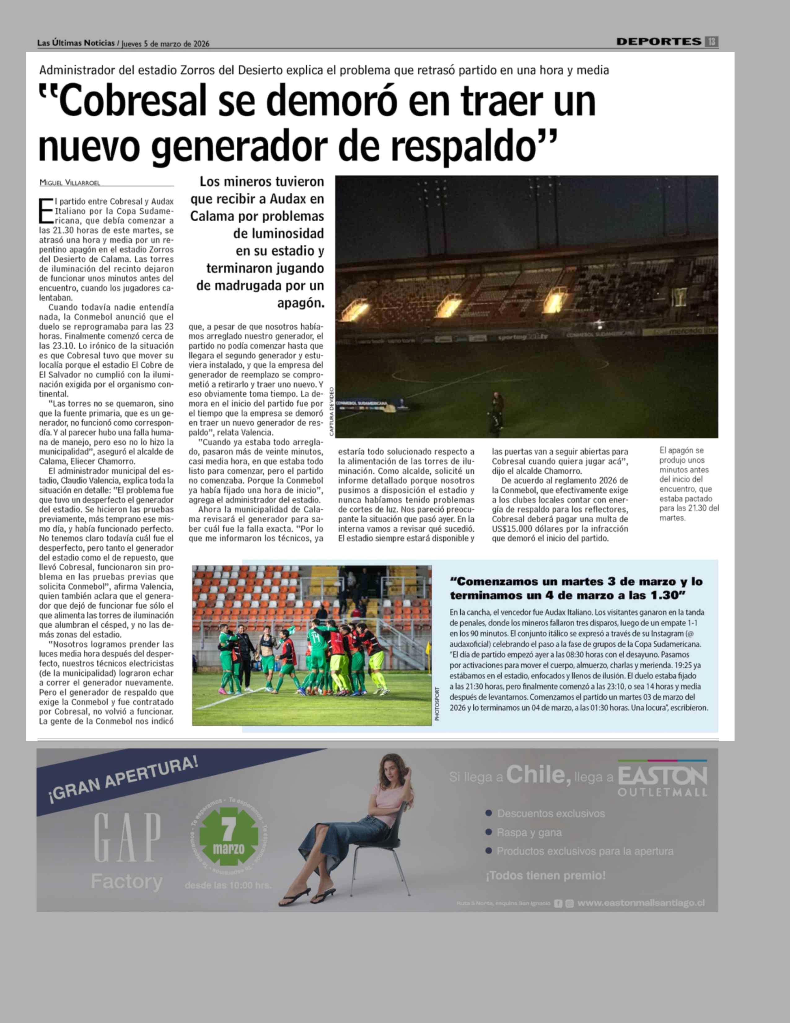 "Cobresal se demoró en traer un nuevo generador de respaldo" 05-03-2026 Las Últimas Noticias |