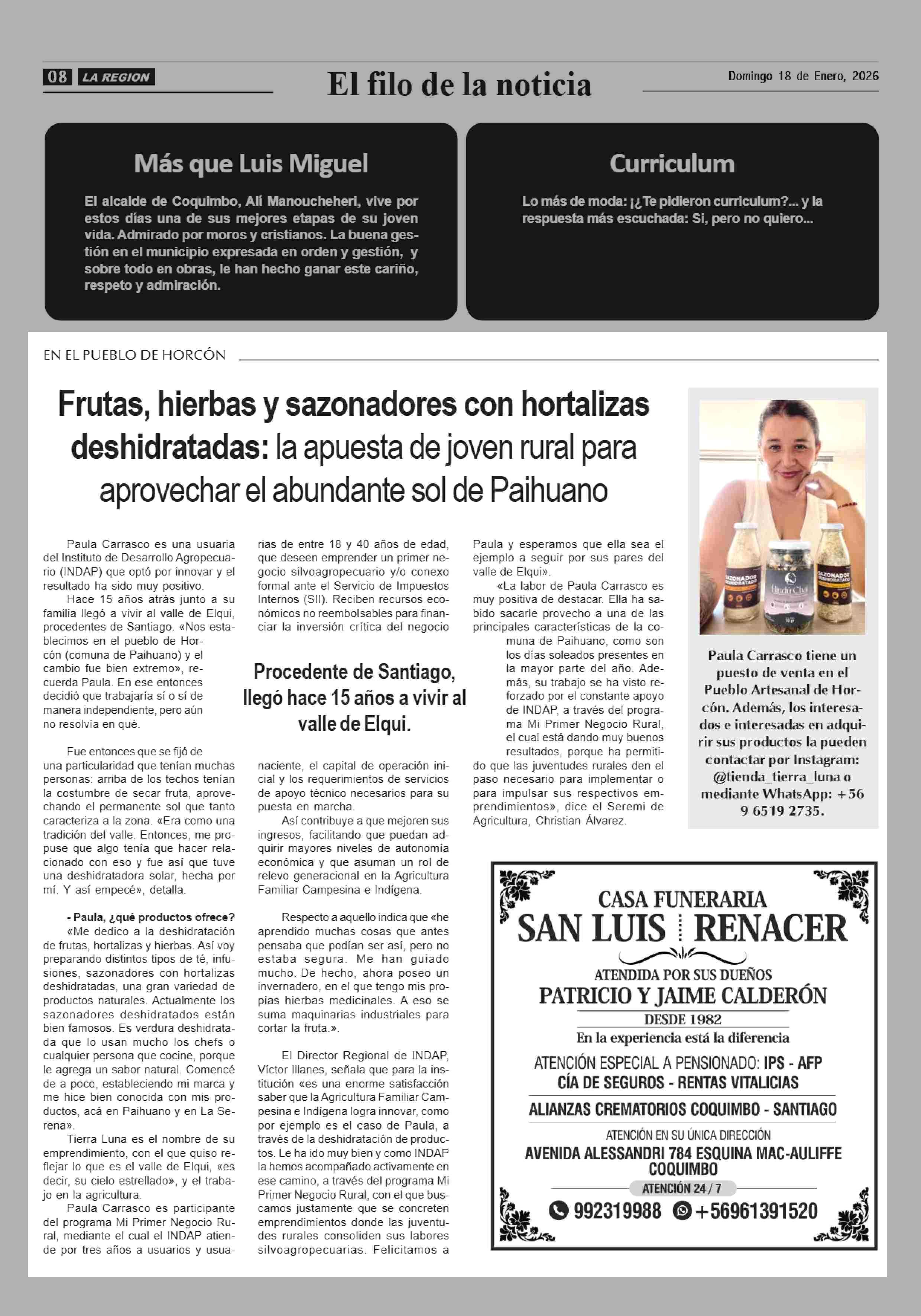 Frutas, hierbas y sazonadores con hortalizas deshidratadas: la apuesta de joven rural para aprovechar el abundante sol de Paihuano 18-01-2026 Diario la Región |