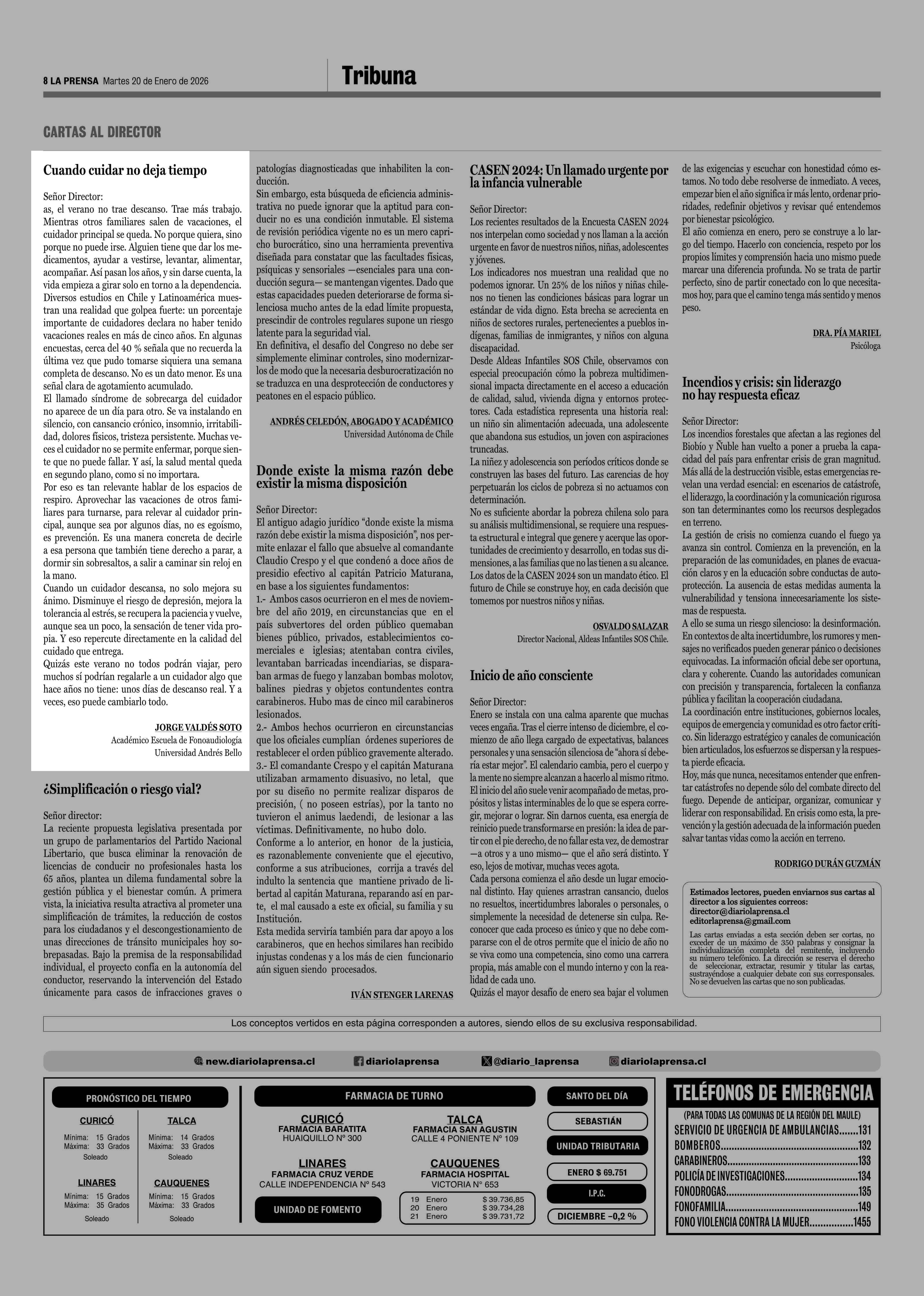 Cartas: Cuando cuidar no deja tiempo 20-01-2026 La Prensa de Curicó |