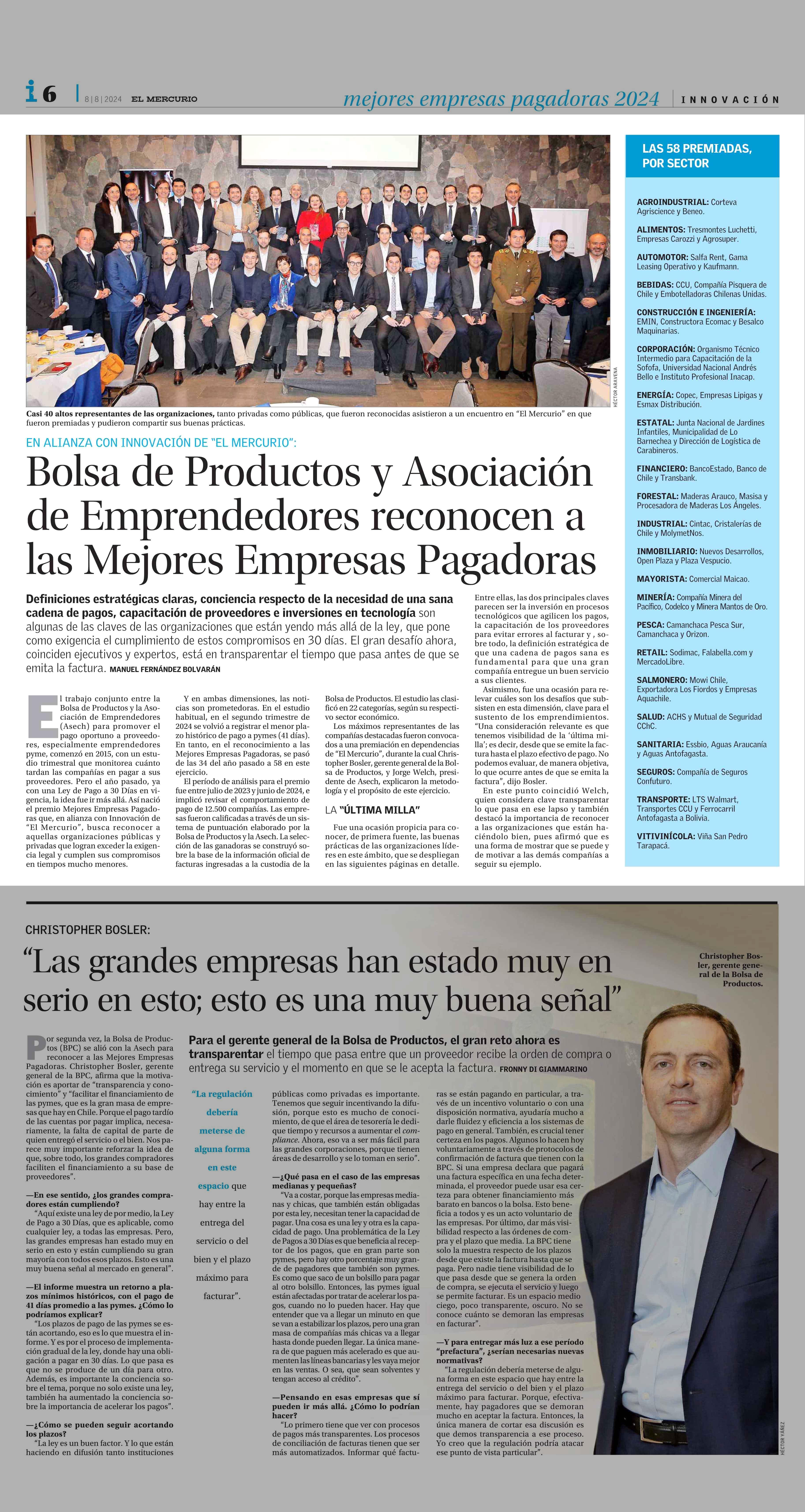 Bolsa de Productos y Asociación de Emprendedores reconocen a las Mejores Empresas Pagadoras 08-08-2024 El Mercurio |