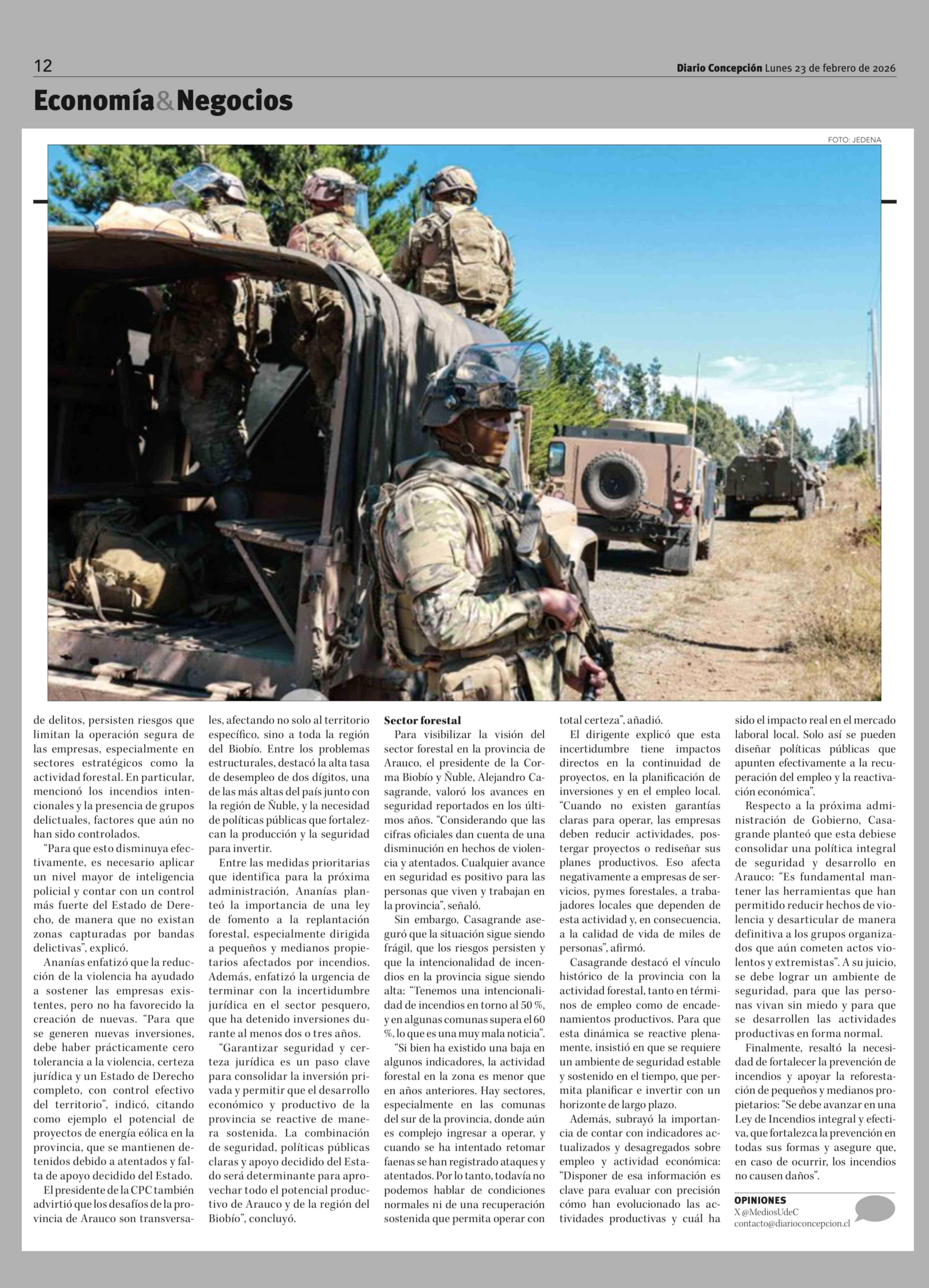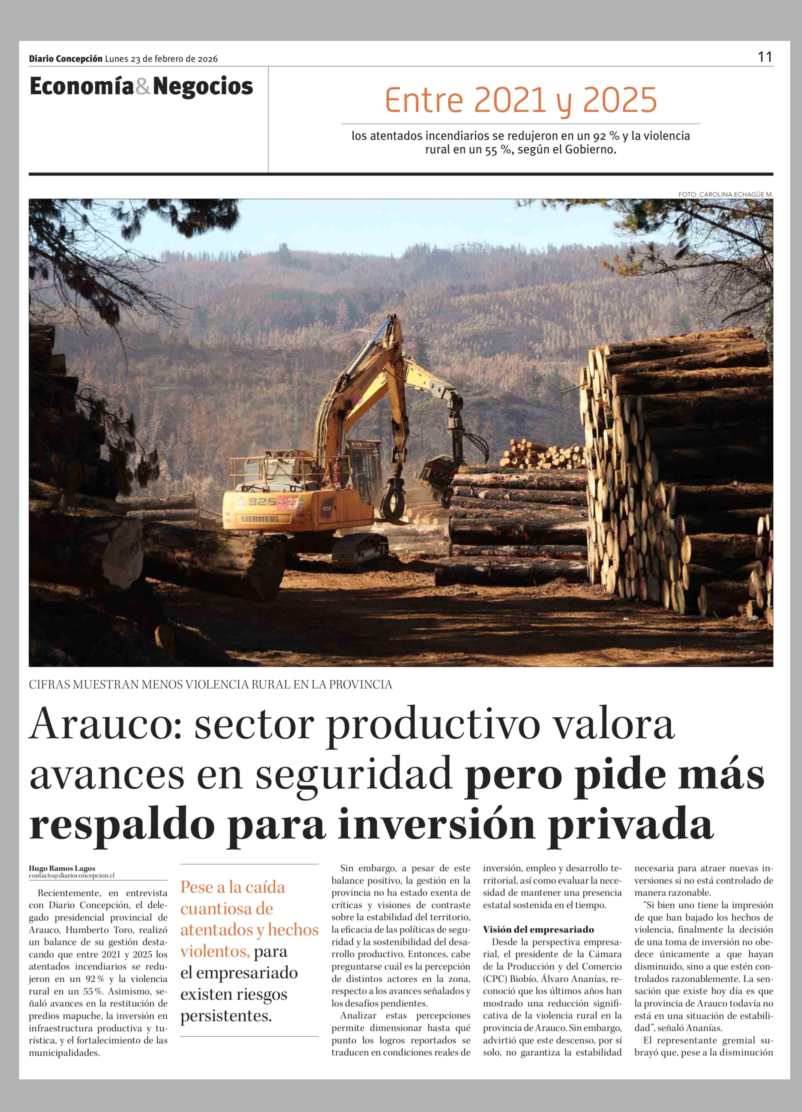 Arauco: sector productivo valora avances en seguridad pero pide más respaldo para inversión privada 23-02-2026 Diario Concepción |