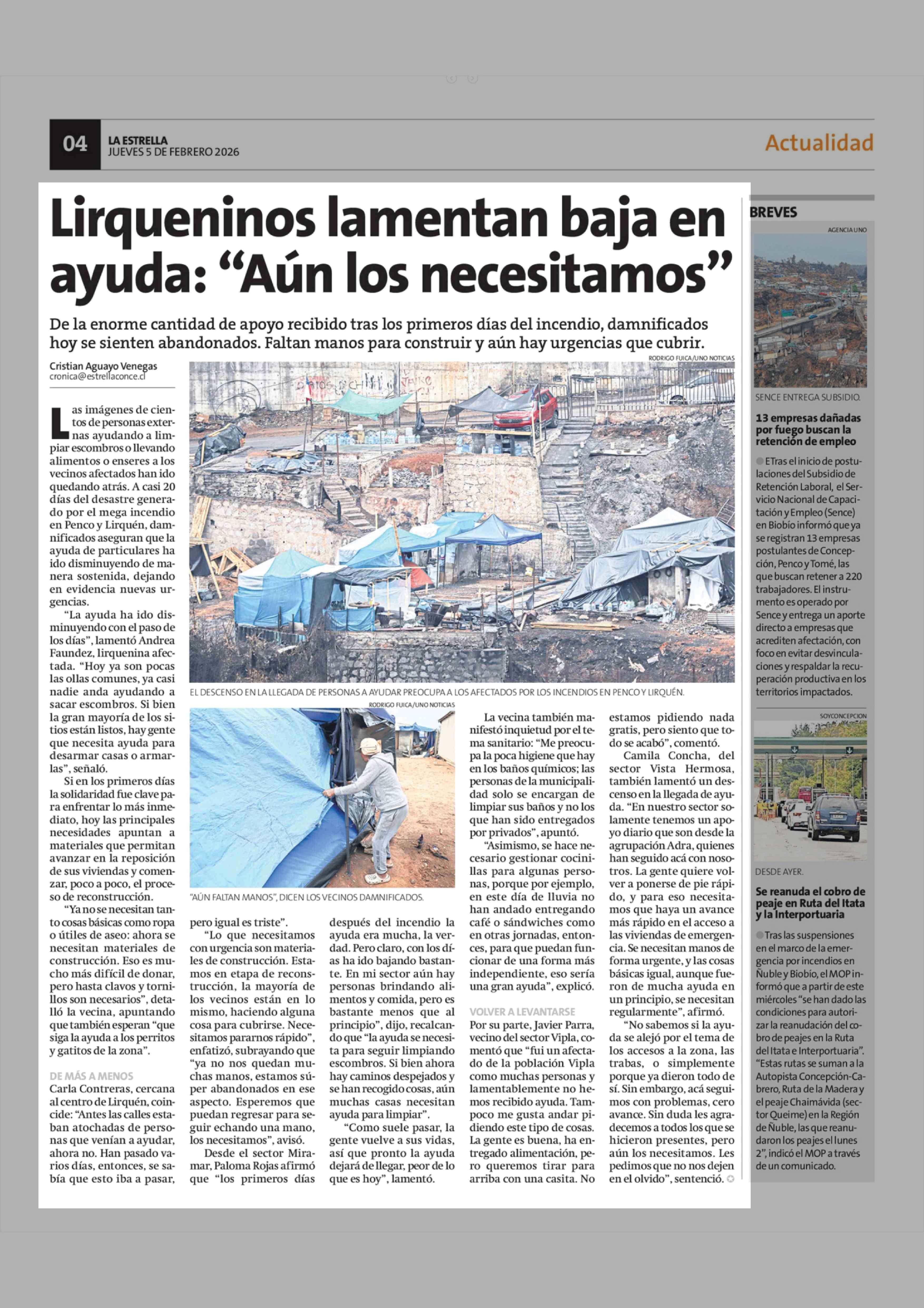 Lirqueninos lamentan baja en ayuda: "Aún los necesitamos" 05-02-2026 La Estrella de Concepción |