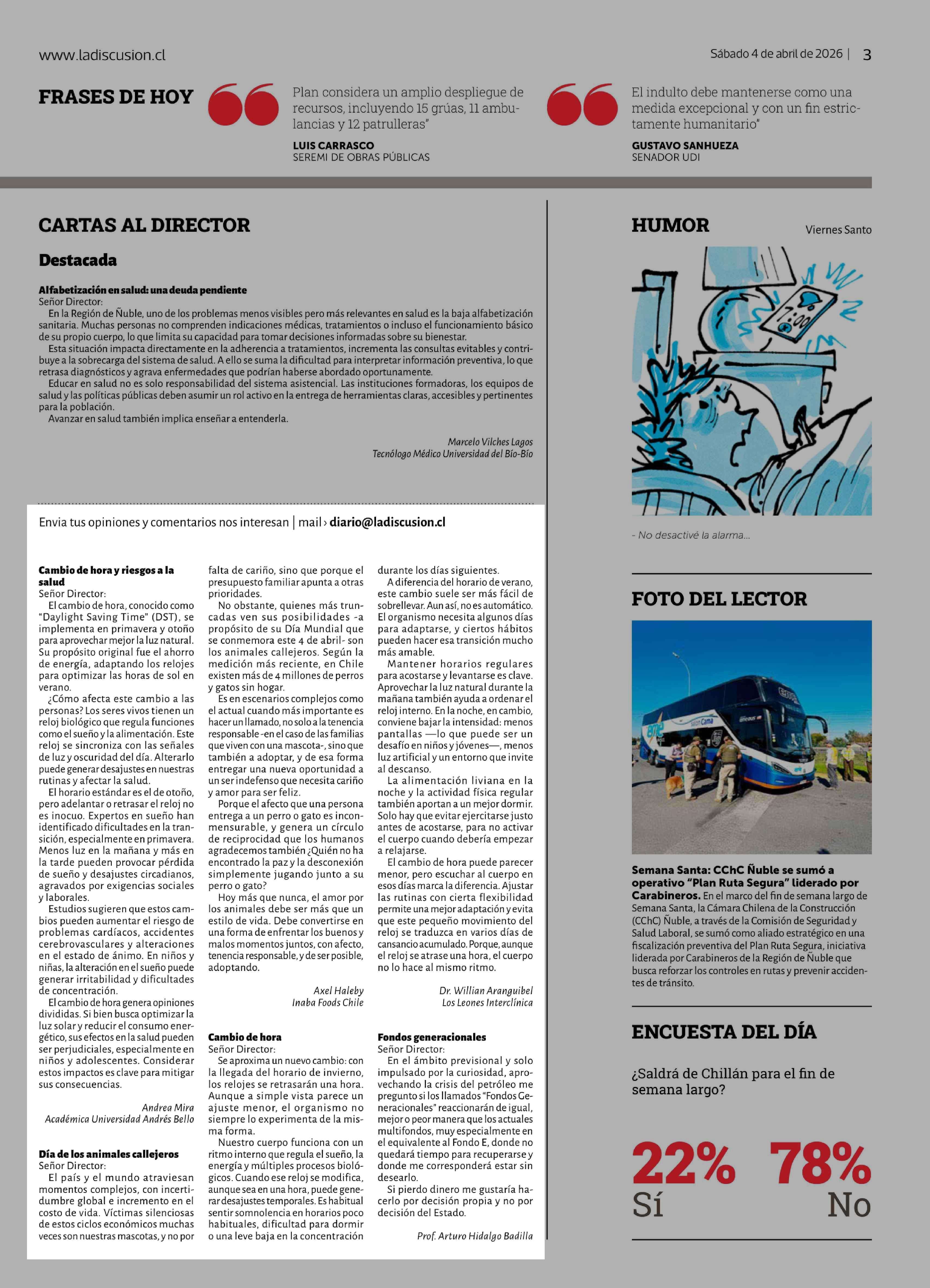 | Título: | Cartas: Cambio de hora y riesgos a la salud Señor Director: El cambio de hora, conocido como "Daylight Saving Time" (DST), se implementa en primavera y otoño para aprovechar mejor la luz natural. Su propósito original fue el ahorro de energía, adaptando los relojes para optimizar las horas de sol en |