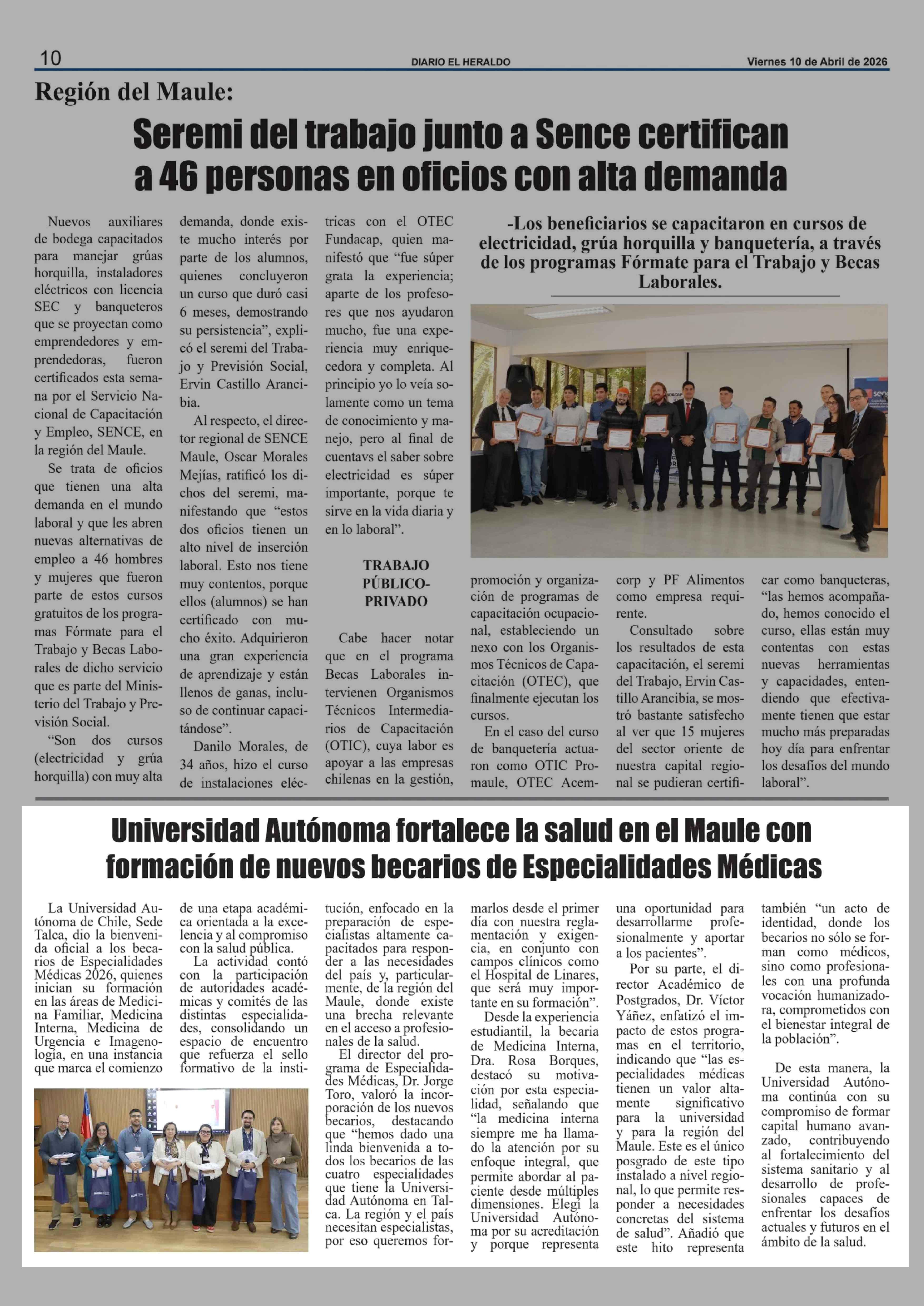 Universidad Autónoma fortalece la salud en el Maule con formación de nuevos becarios de Especialidades Médicas 10-04-2026 El Heraldo |