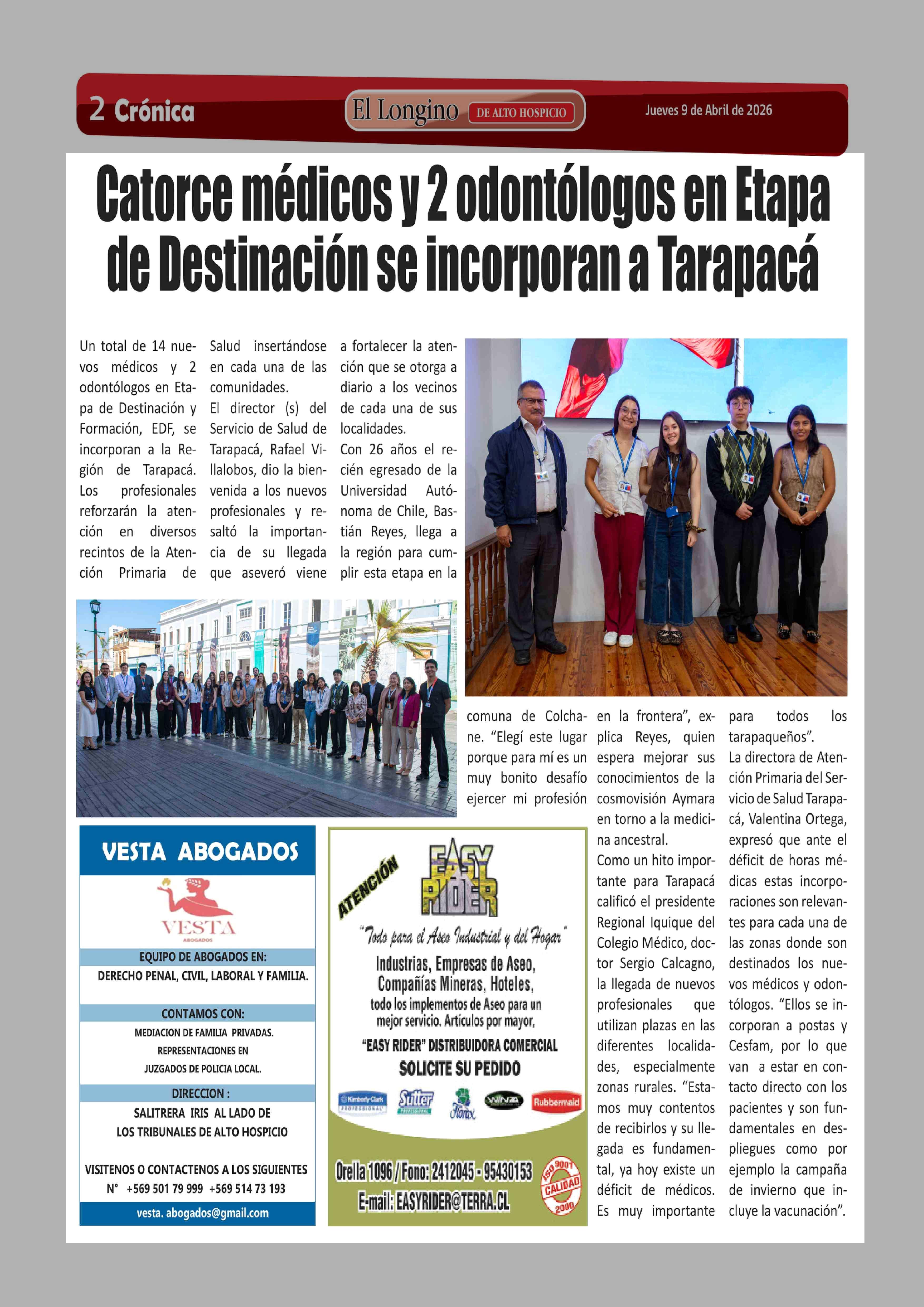 Catorce médicos y 2 odontólogos en Etapa de Destinación se incorporan a Tarapacá 09-04-2026 El Longino |