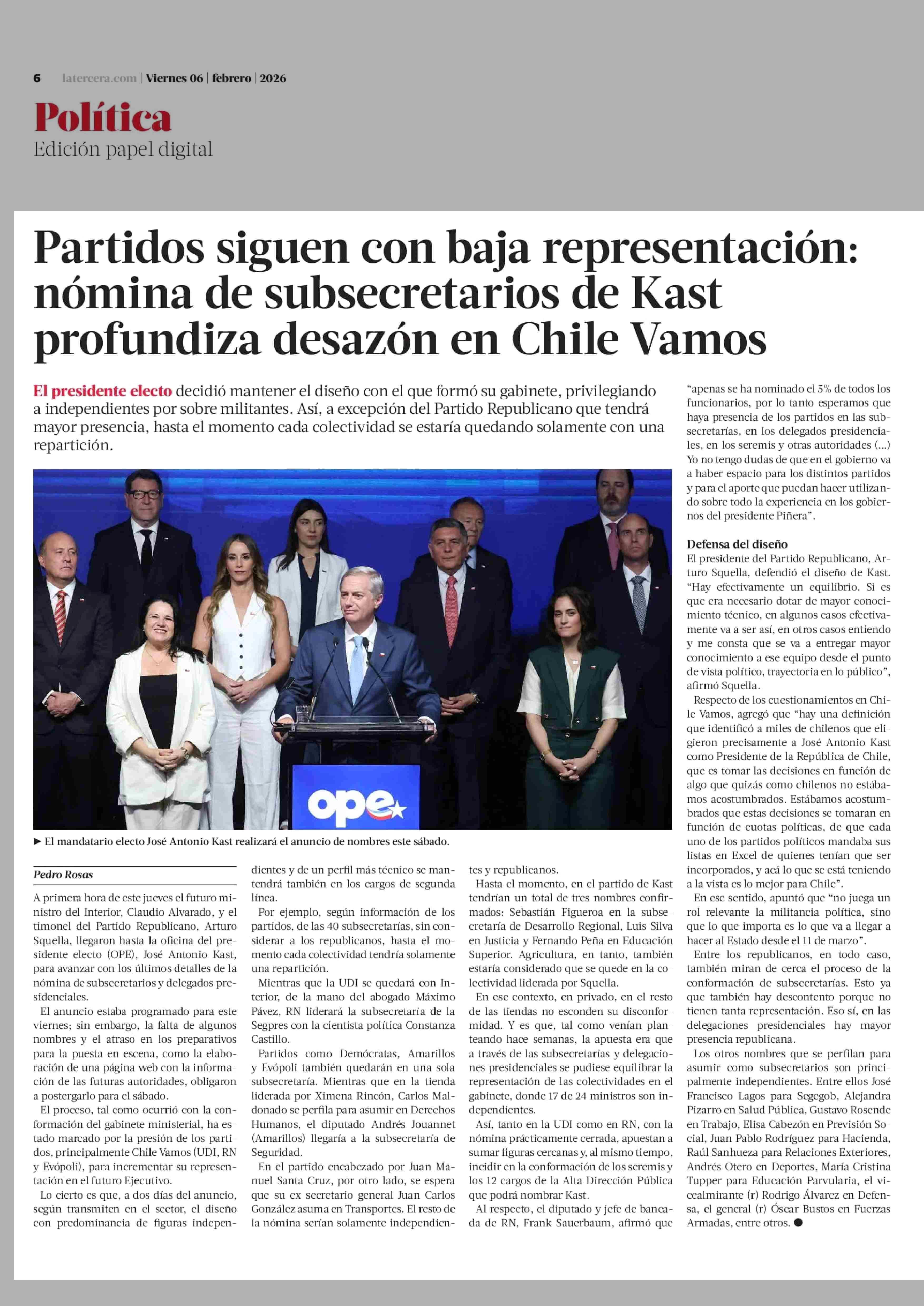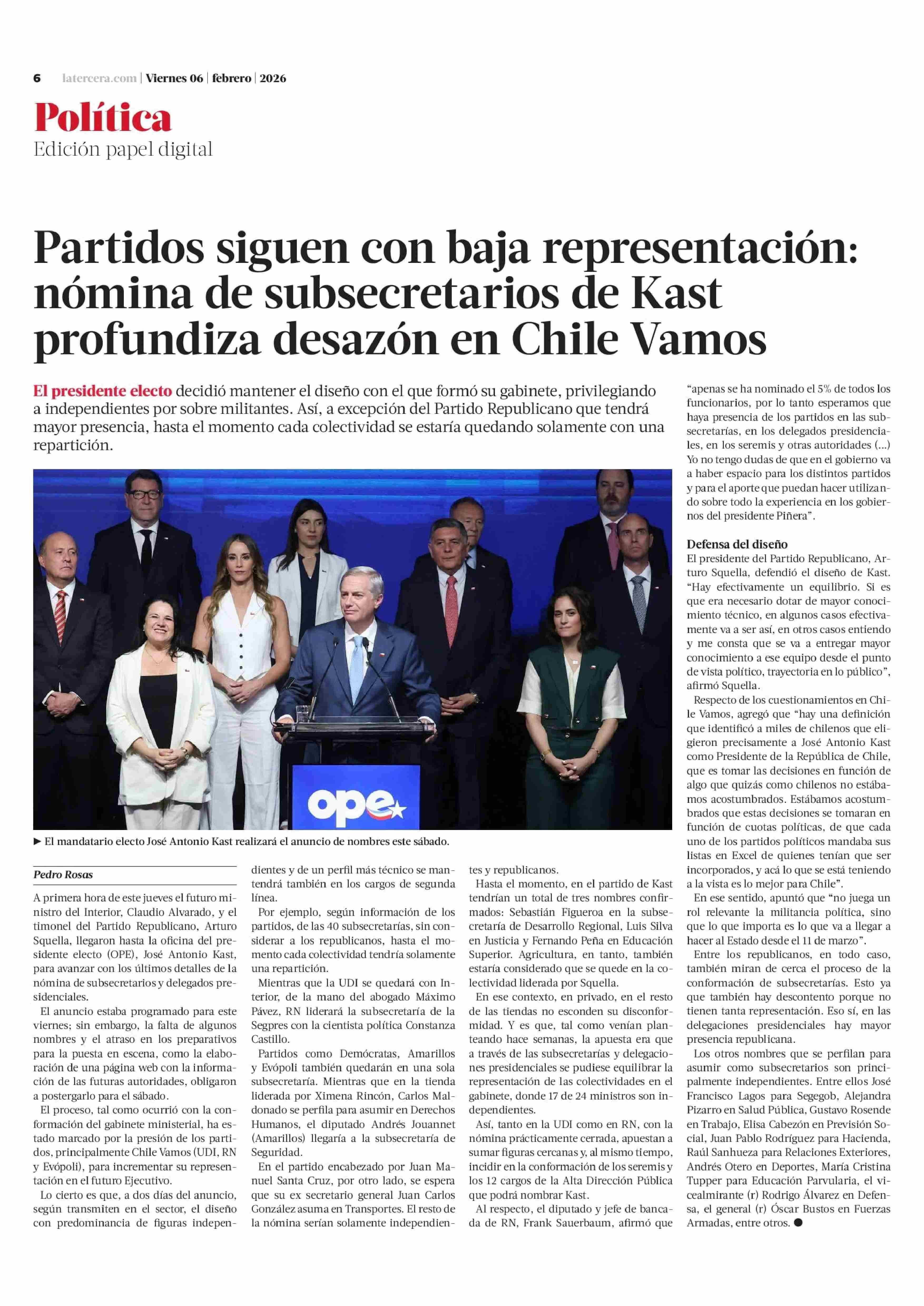 Partidos siguen con baja representación: nómina de subsecretarios de Kast profundiza desazón en Chile Vamos 06-02-2026 La Tercera |