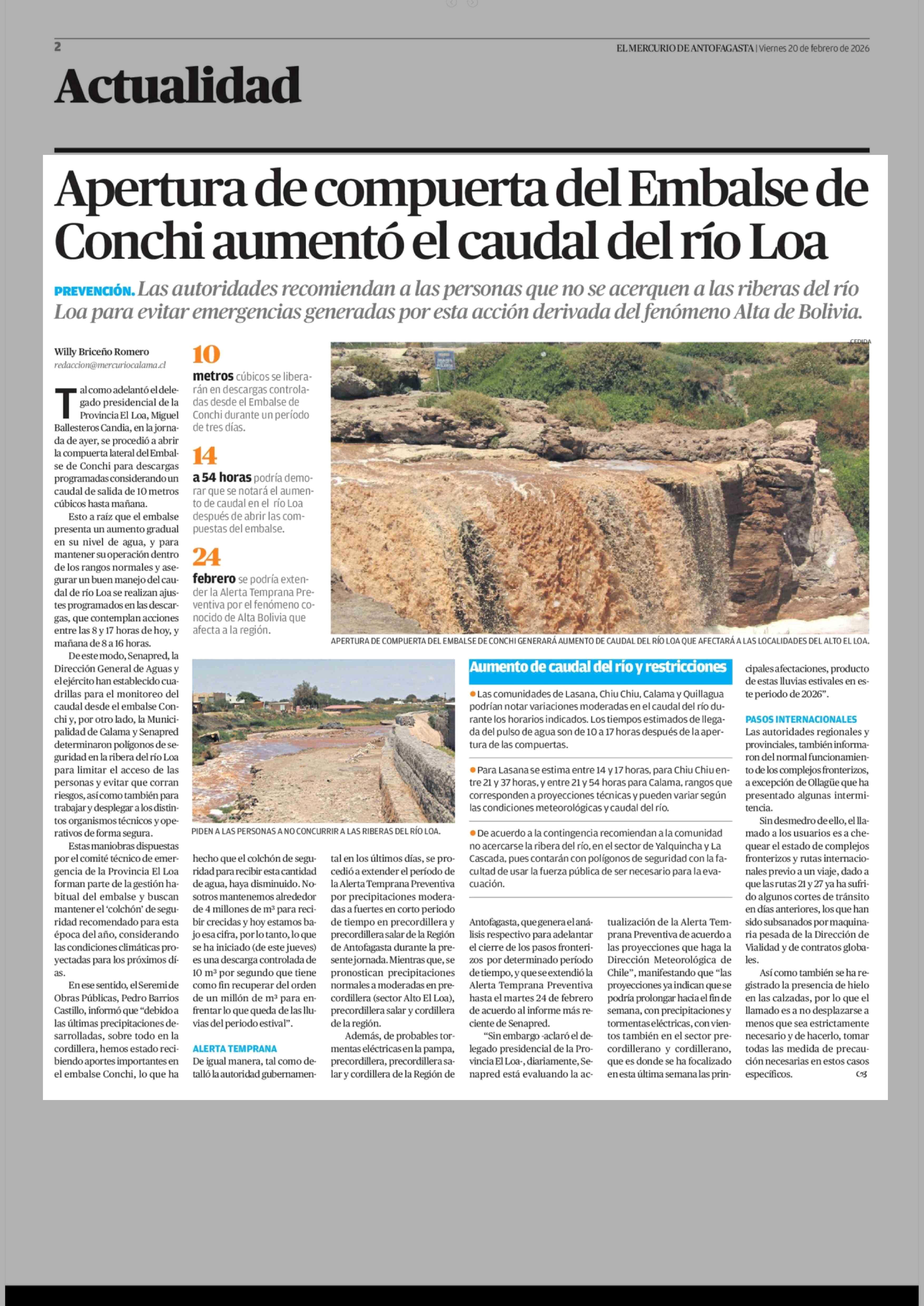 Apertura de compuerta del Embalse de Conchi aumentó el caudal del río Loa 20-02-2026 El Mercurio de Antofagasta |