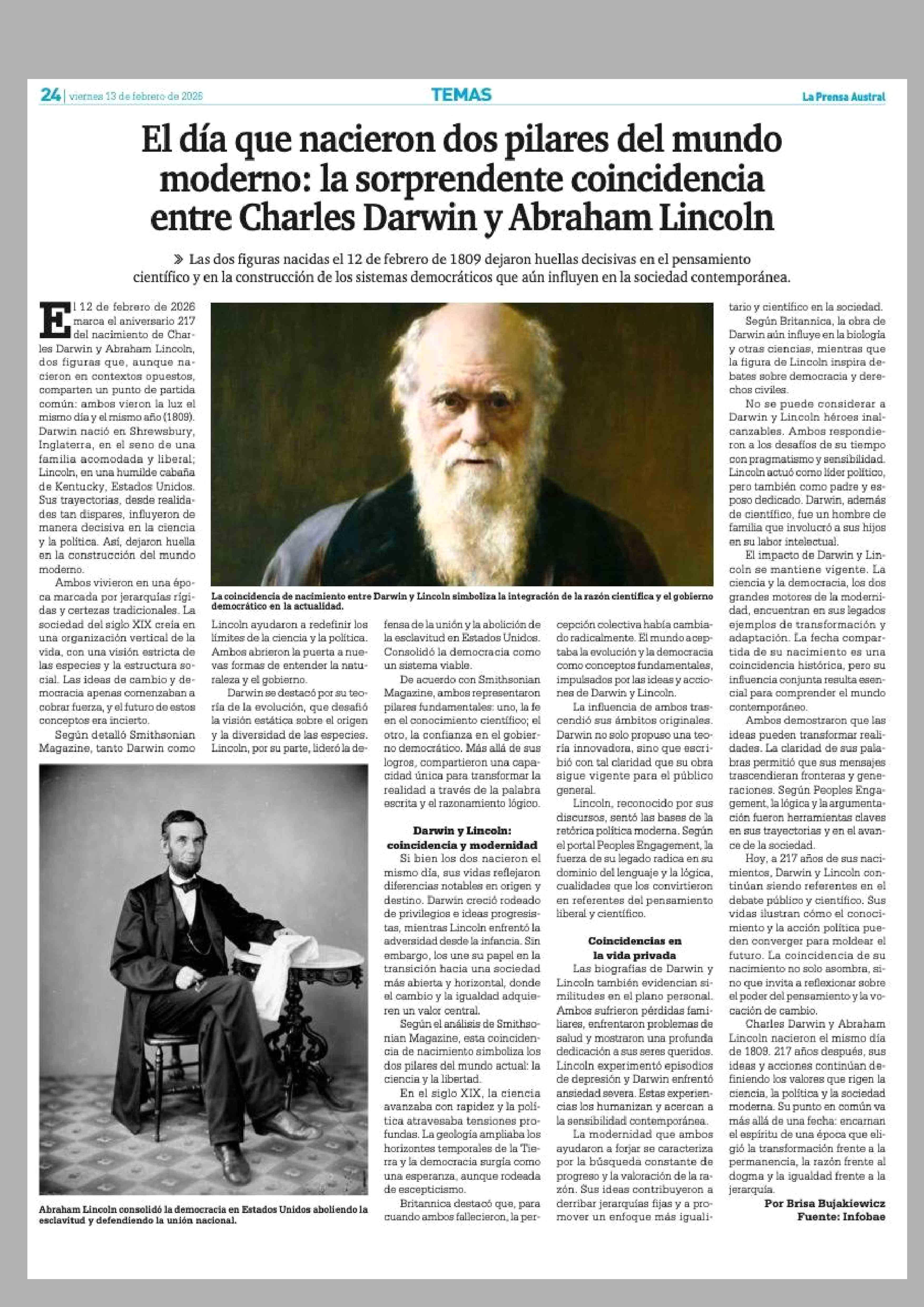 El día que nacieron dos pilares del mundo moderno: la sorprendente coincidencia entre Charles Darwin y Abraham Lincoln 13-02-2026 La Prensa Austral |