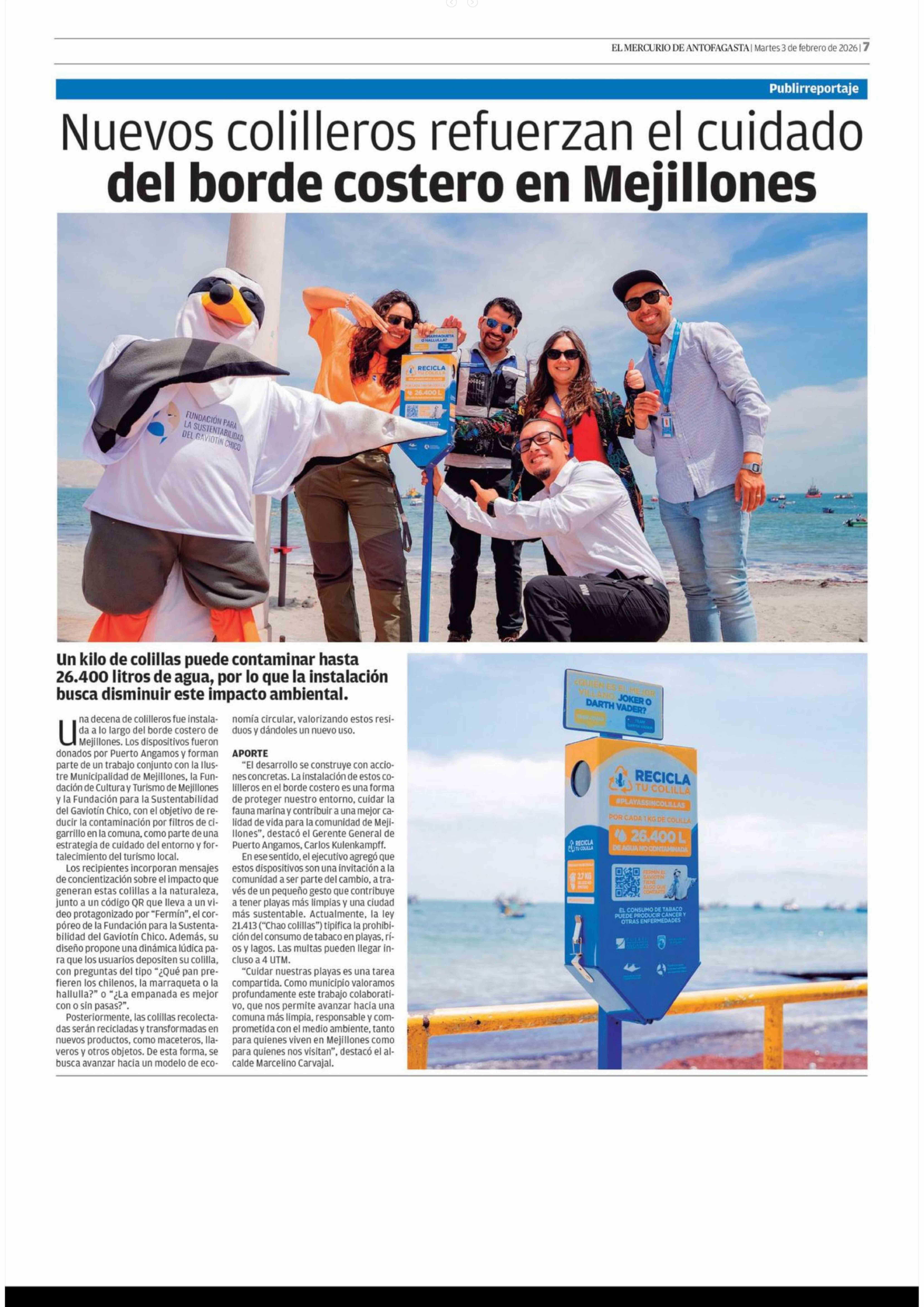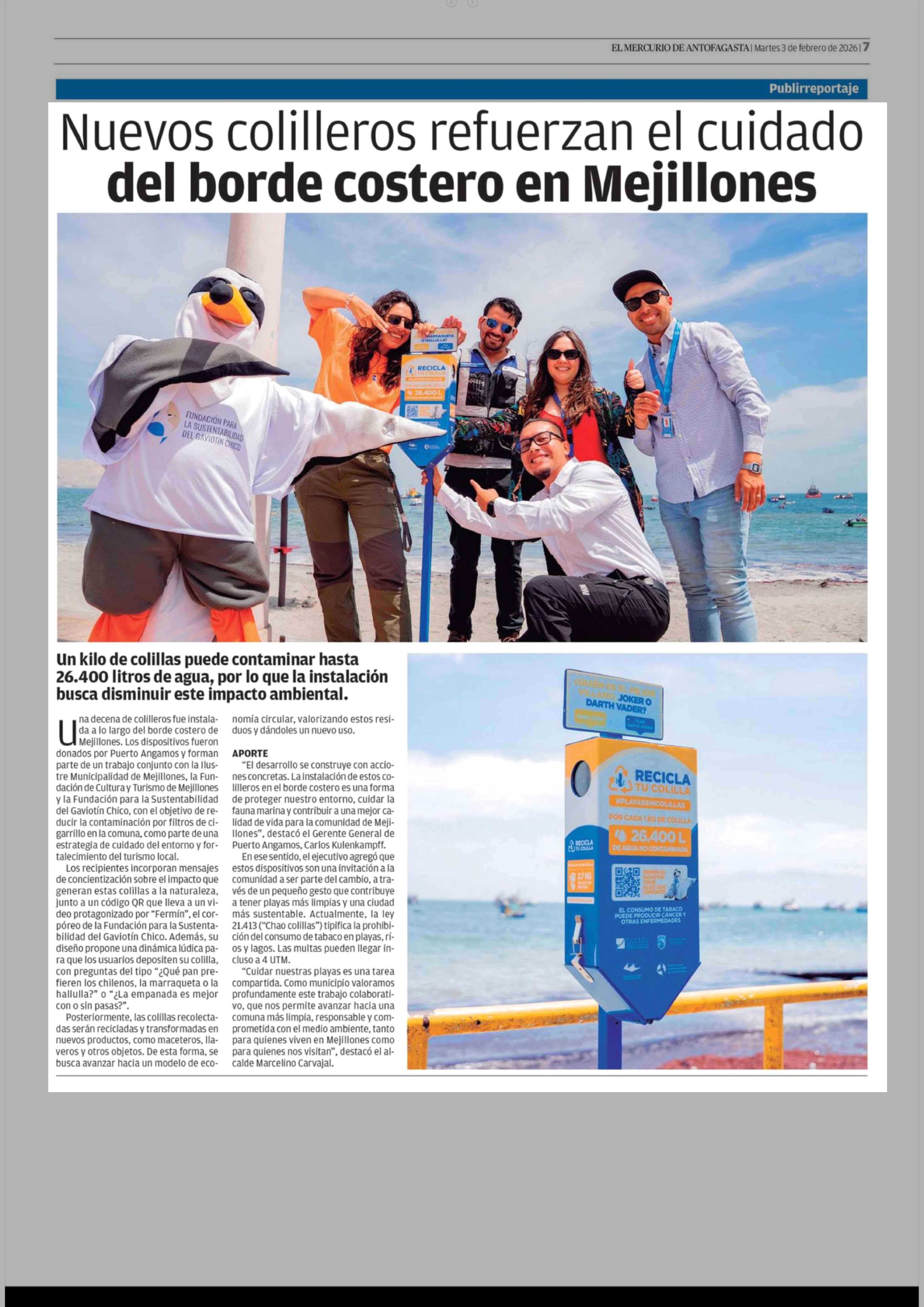 Nuevos colilleros refuerzan el cuidado del borde costero en Mejillones 03-02-2026 El Mercurio de Antofagasta |