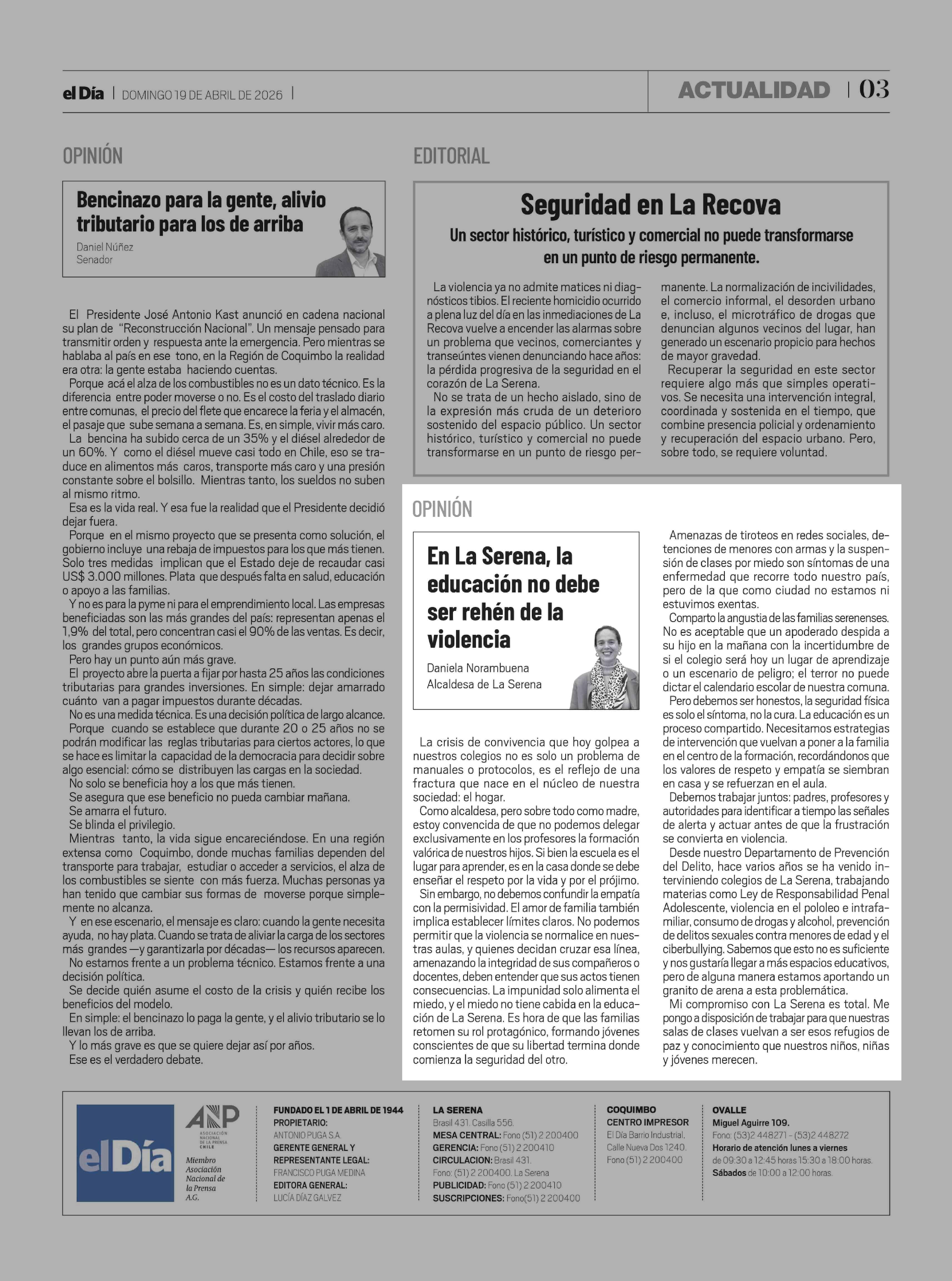 Columnas de Opinión: En La Serena, la educación no debe ser rehén de la violencia 19-04-2026 El Día |