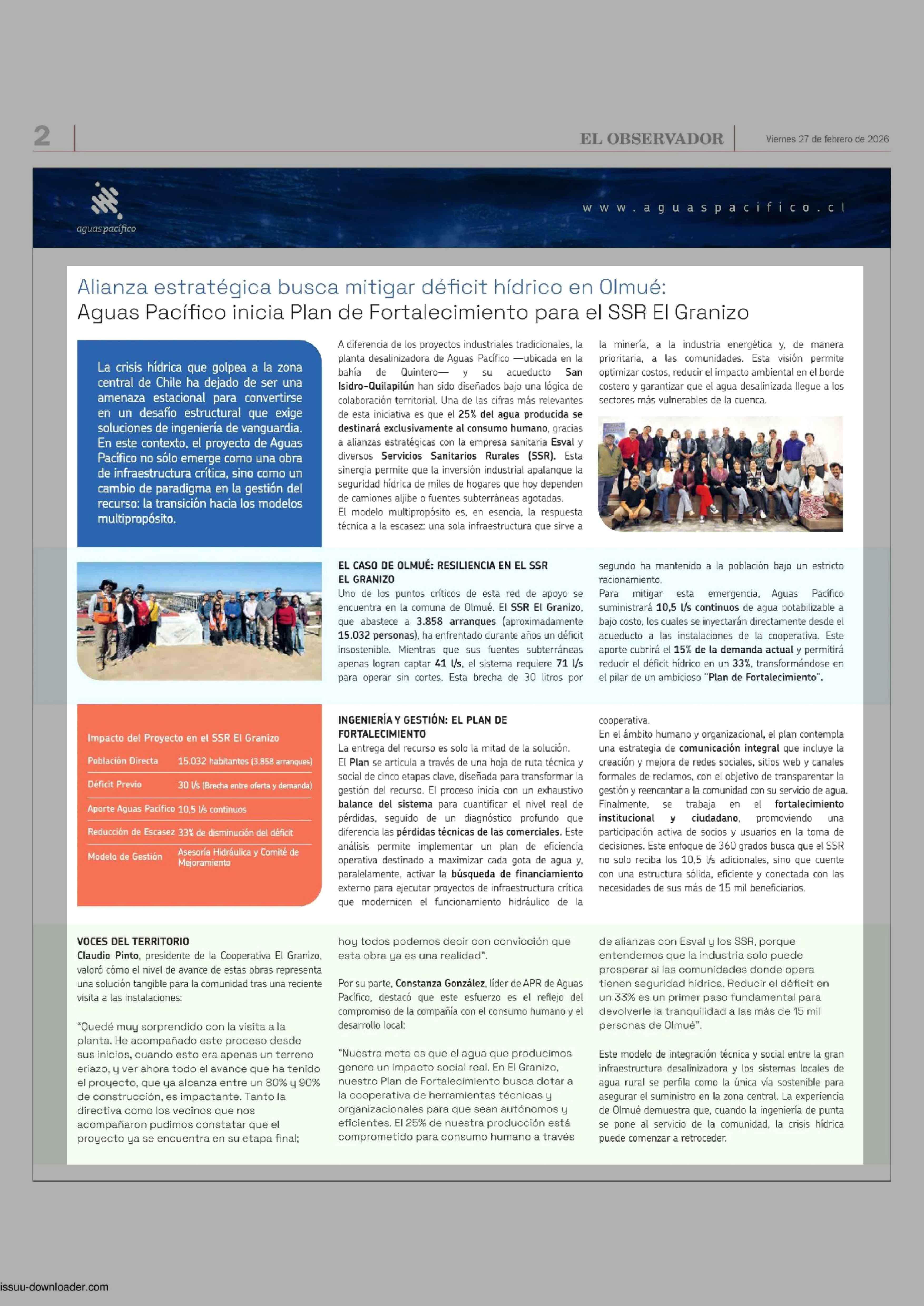 Alianza estratégica busca mitigar déficit hídrico en Olmué: Aguas Pacífico inicia Plan de Fortalecimiento para el SSR El Granizo 27-02-2026 El Observador |