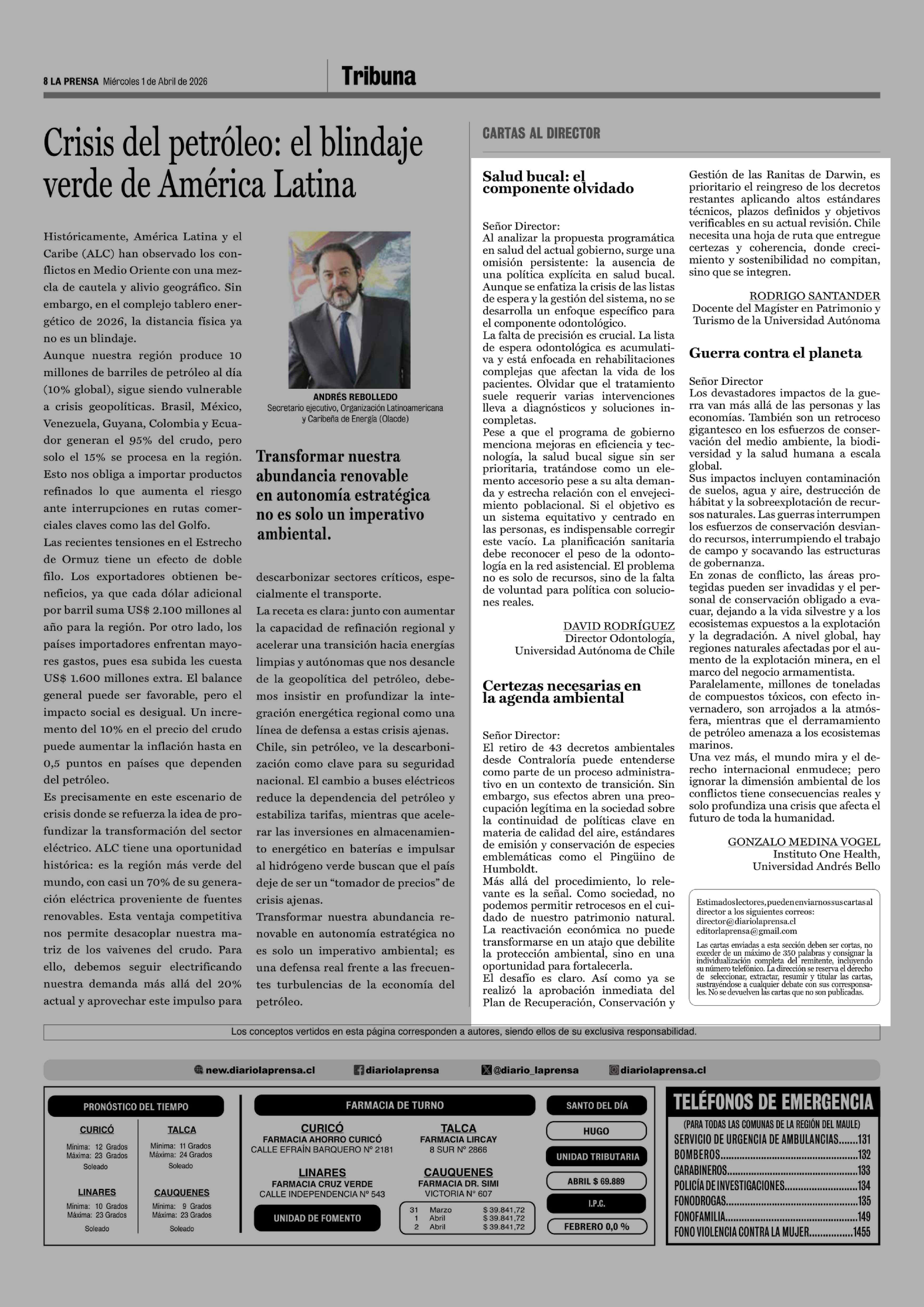 Cartas: Certezas necesarias en la agenda ambiental 01-04-2026 La Prensa de Curicó |