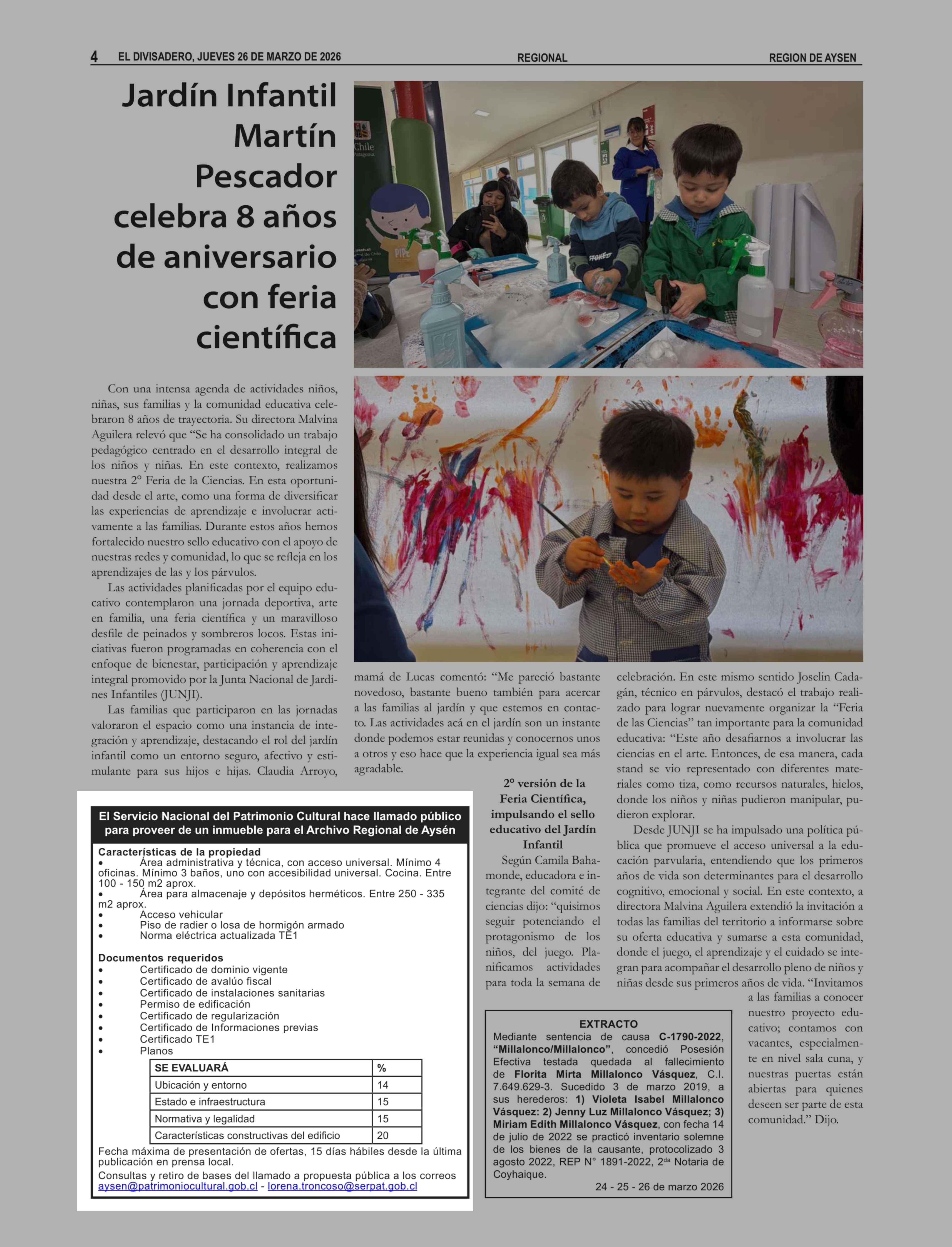 Título: EXTRACTOS: El servicio Nacional del Patrimonio Cultural hace llamado público para proveer de un unmueble para el Archivo regional de Aysén