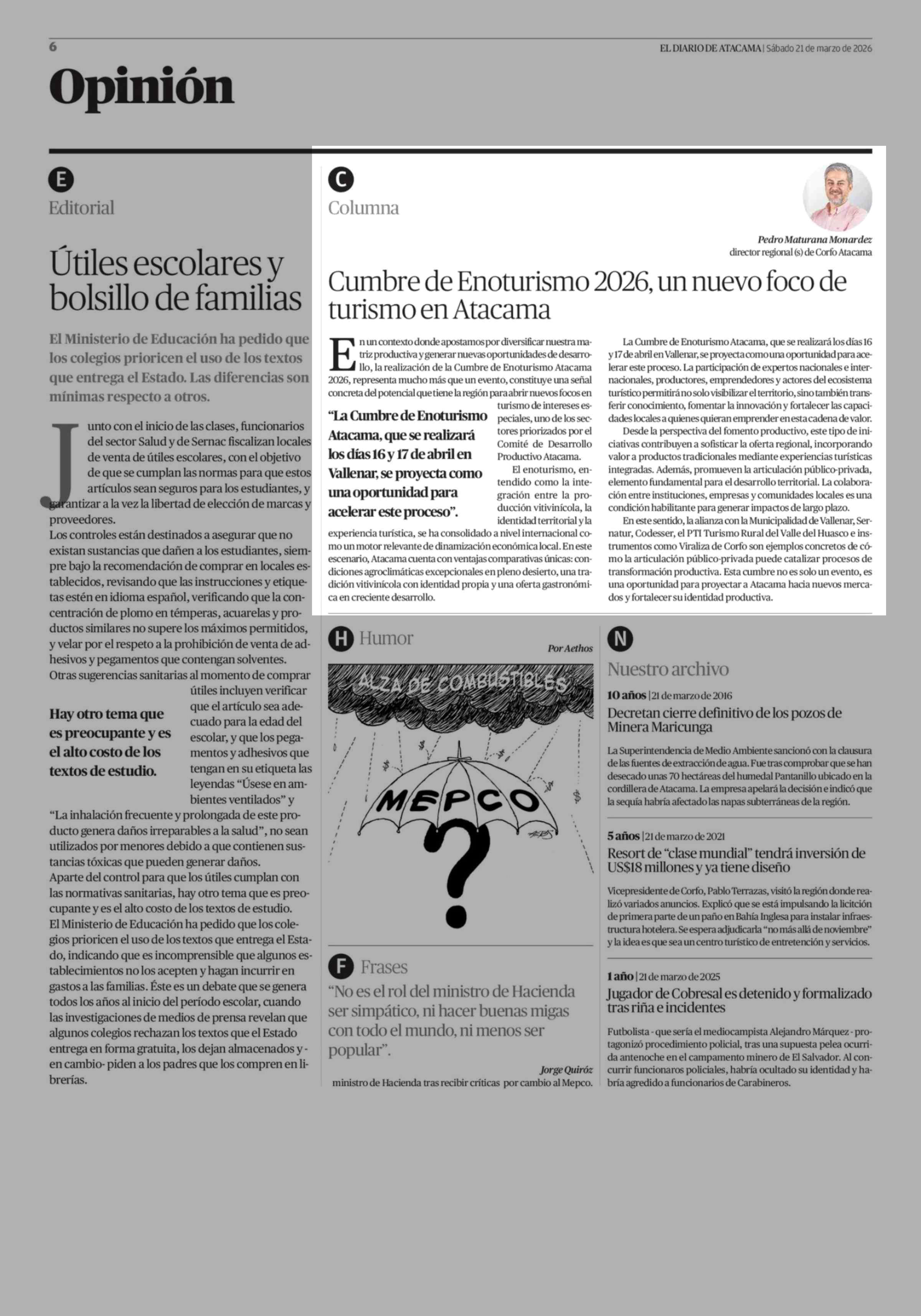 Columnas de Opinión: Cumbre de Enoturismo 2026, un nuevo foco de turismo en Atacama 21-03-2026 El Diario de Atacama |