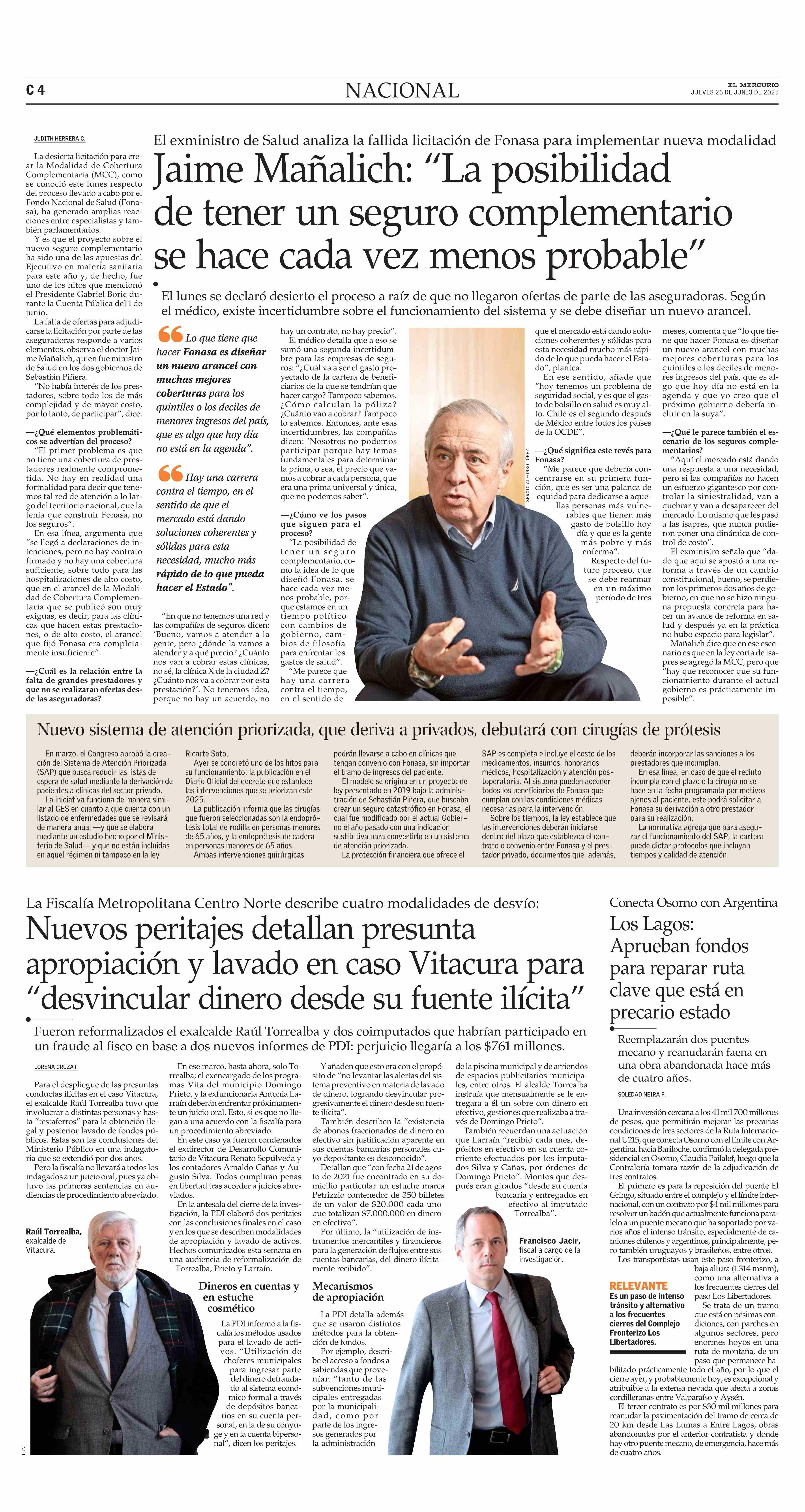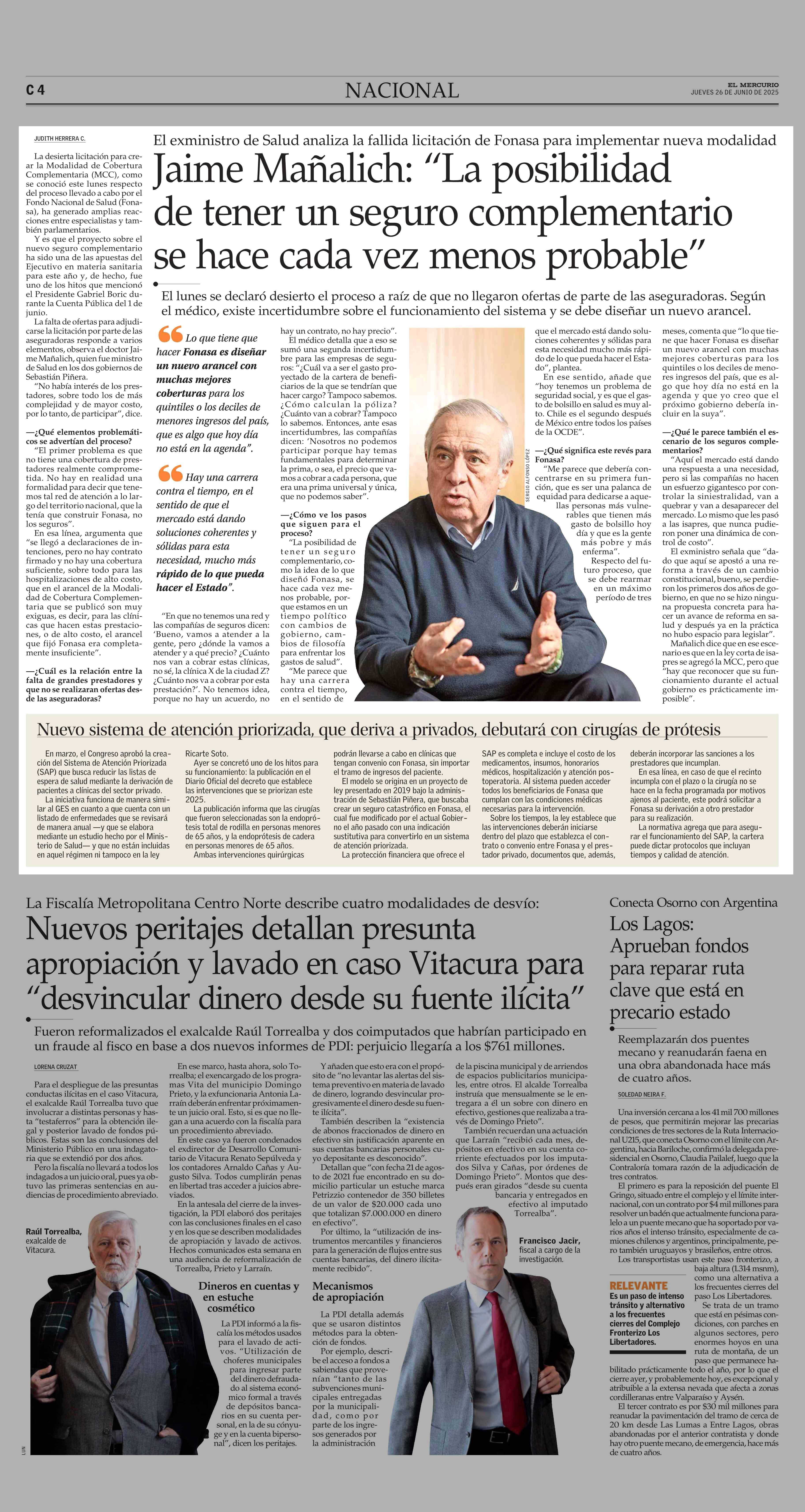 Jaime Mañalich: “La posibilidad de tener un seguro complementario se hace cada vez menos probable” 26-06-2025 El Mercurio |