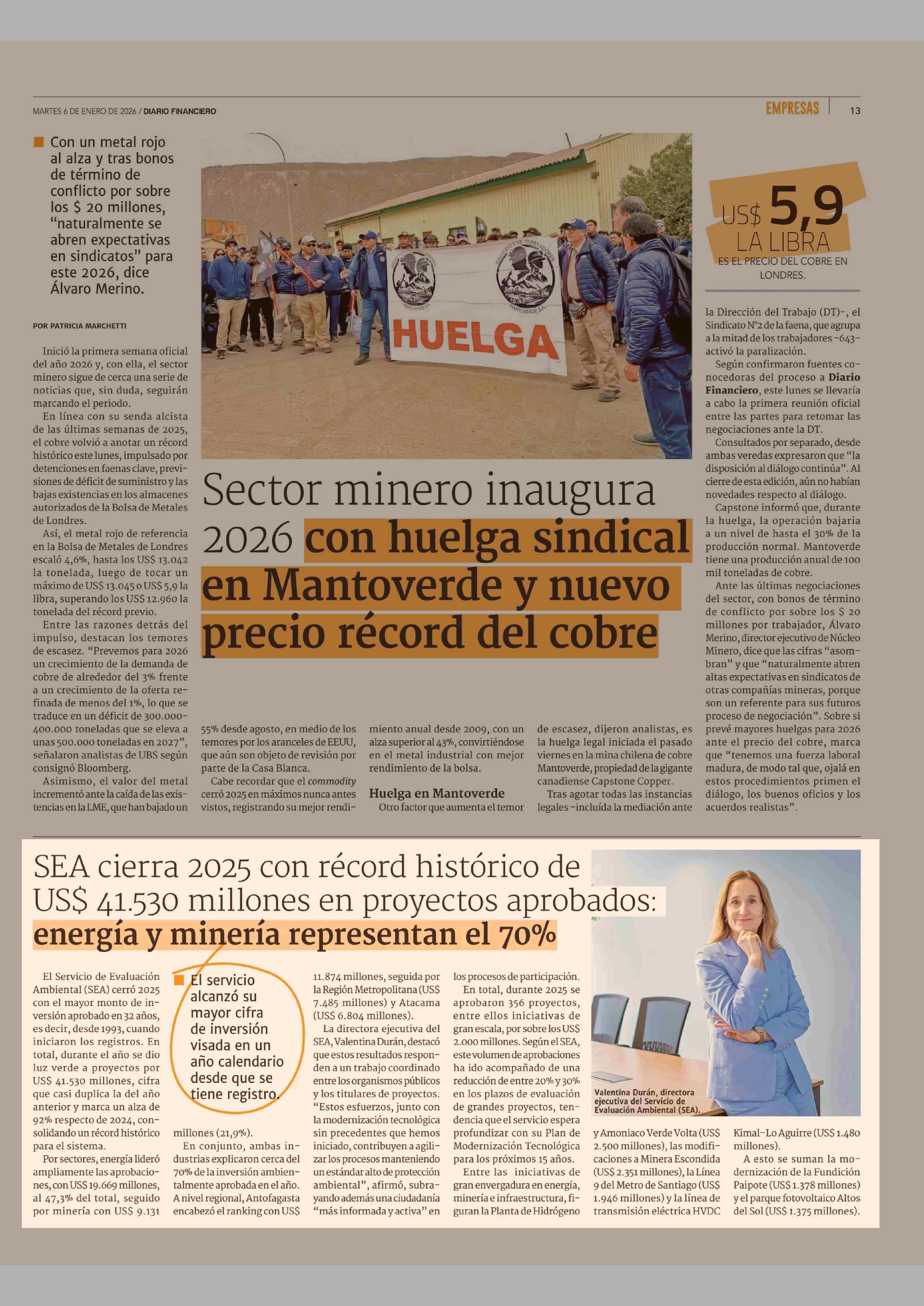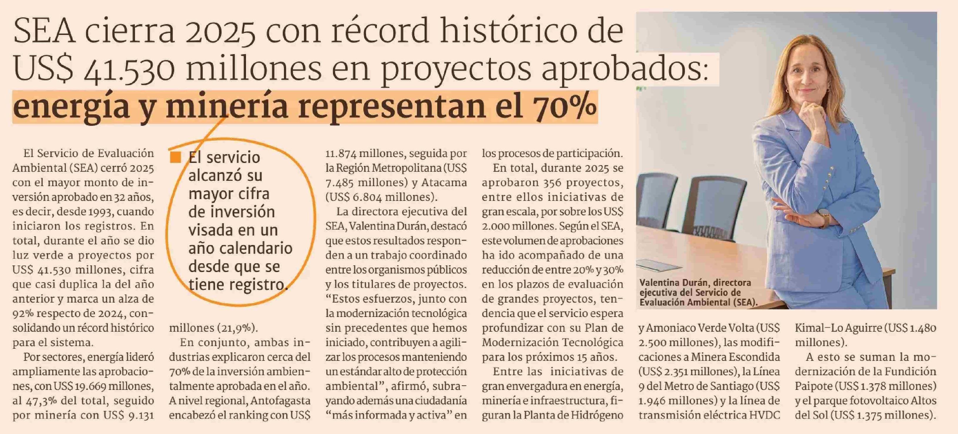 SEA cierra 2025 con récord histórico de US$ 41.530 millones en proyectos aprobados: energía y minería representan el 70% 06-01-2026 Diario Financiero |