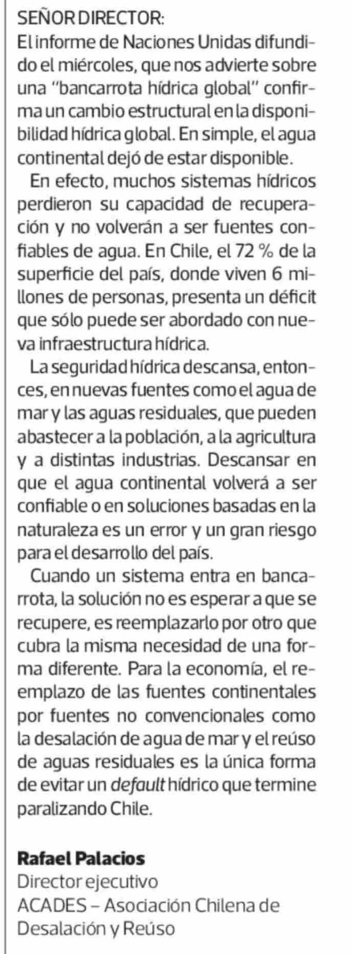 CARTAS: BANCARROTA HÍDRICA 24-01-2026 La Tercera |